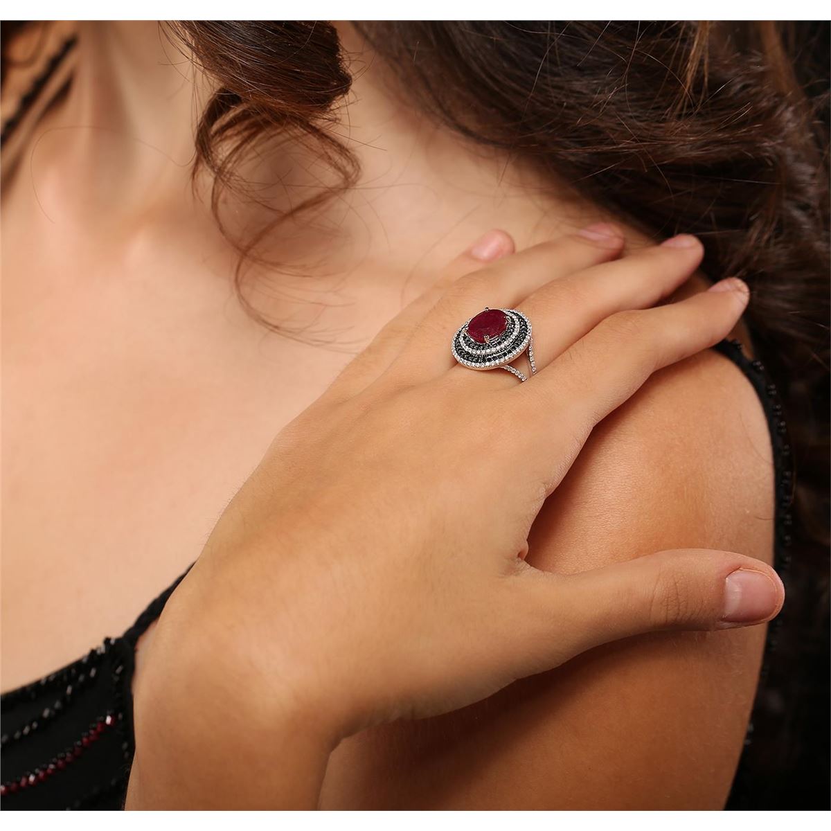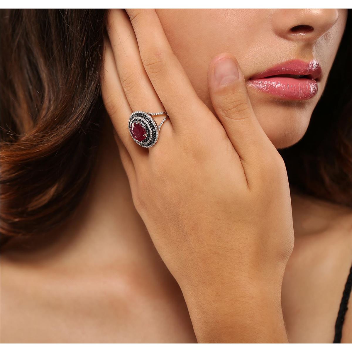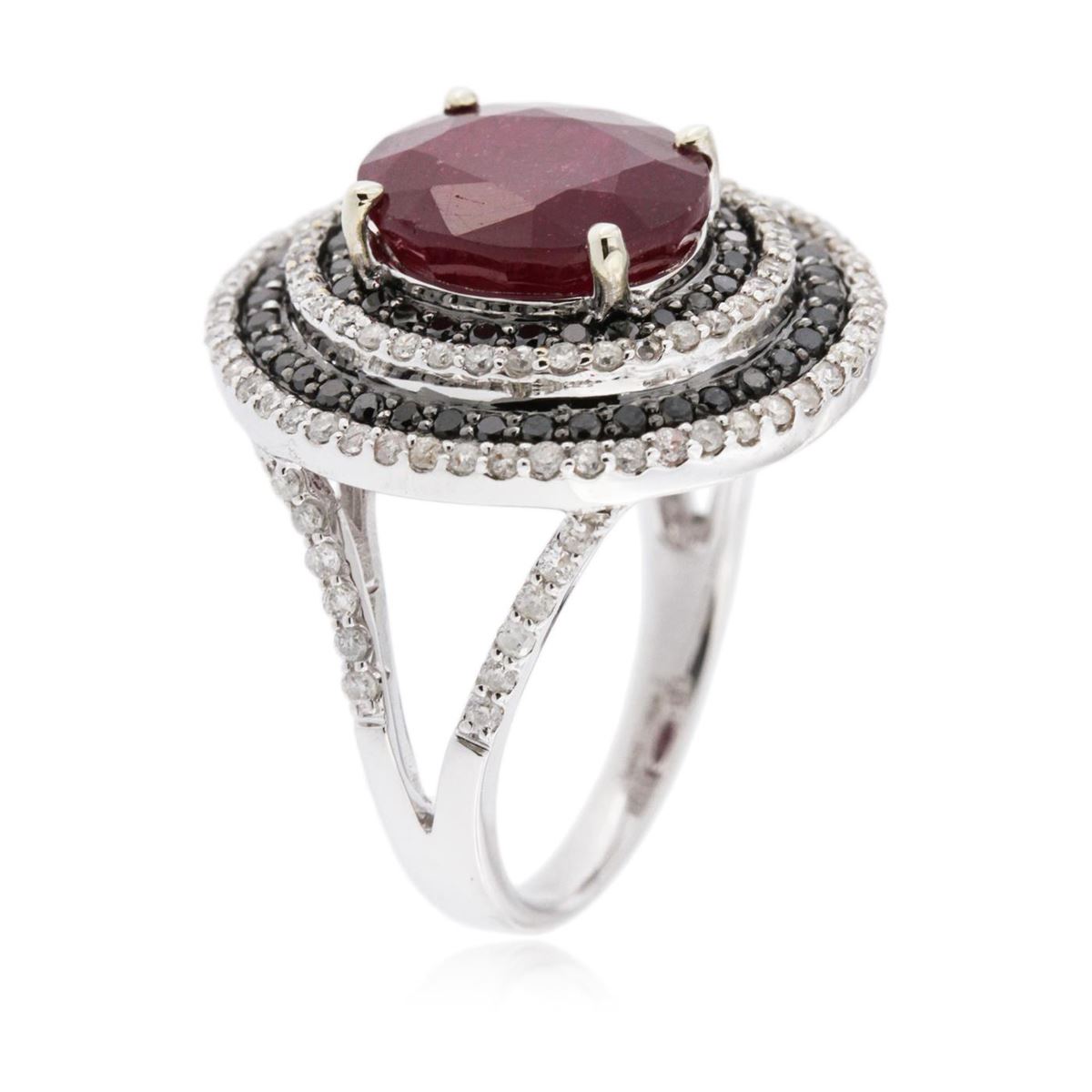 One electronically tested 14KT white gold Ladies combination cast & assembled cocktail ring with a bright polish finish. Identified with markings of "14K". Condition is excellent. Containing: One oval modified brilliant cut natural ruby, measuring 10.70 x 9.20 x 6.10mm, approximate weight of 5.55ct., type II Indications of heat treatment with glass and flux residue. Colored gemstones are presumed to have been subjected to commonly used and possible undetectable color/clarity enhancement processes. One Hundred Ten prong set round brilliant cut diamonds, measuring 1.00 - 1.00 x 0.60mm (depth est.) approximate total weight of 110 Stones = 0.58ct. Clarity of I-2 to I-3, Color of H - I. Sixty-Four prong set round brilliant cut diamonds, measuring 1.10 - 1.10 x 0.66mm (depth est.) approximate total weight of 64 Stones = 0.44ct. Total Weight of Colored Stones 5.55ct. Total Weight of Diamonds 1.02ct. Total Weight of Ring 7.20gm. GGL Appraised at $6,620.00.