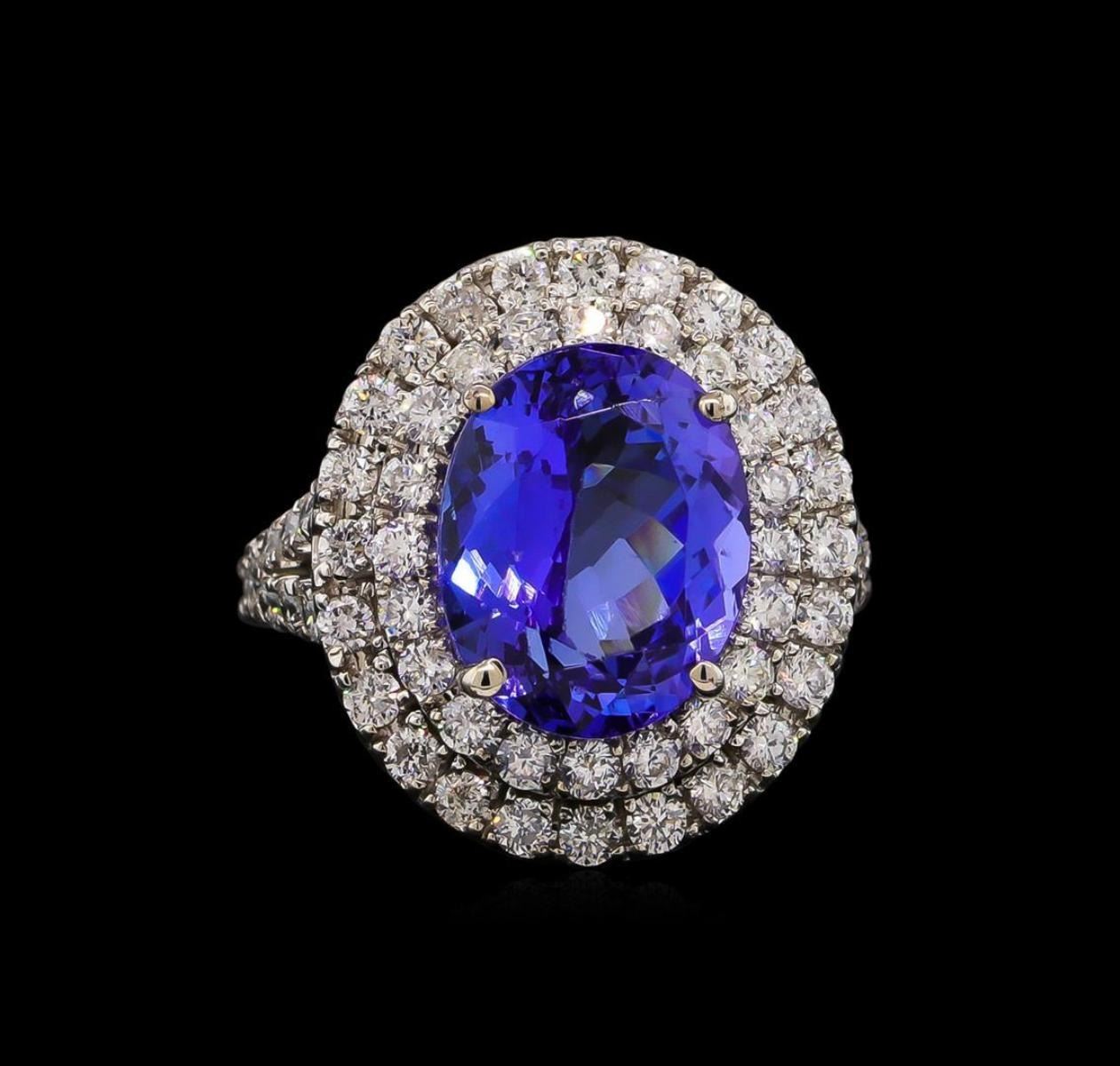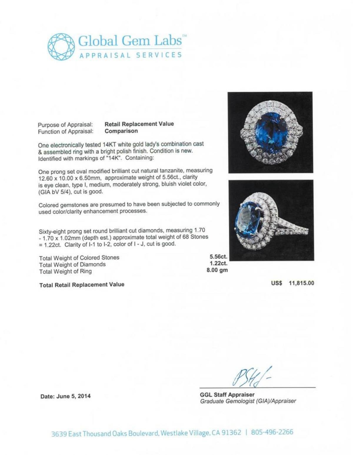 One electronically tested 14KT white gold Ladies combination cast & assembled ring with a bright polish finish. Condition is new. Identified with markings of "14K". Containing: One prong set oval modified brilliant cut natural tanzanite, measuring 12.60 x 10.00 x 6.50mm, approximate weight of 5.56ct., clarity is eye clean, type I, medium, moderately strong, bluish violet color, (GIA bV 5/4), cut is good. Colored gemstones are presumed to have been subjected to commonly used color/clarity enhancement processes. Sixty-Eight prong set round brilliant cut diamonds, measuring 1.70 - 1.70 x 1.02mm (depth est.) approximate. Total Weight of 68 Stones = 1.22ct. Clarity: I-1 to I-2. Color: I - J, Cut is Good. Total Weight of Colored Stones 5.56ct. Total Weight of Diamonds 1.22ct. Total Weight of Ring 8.00 grams. GGL Appraised.