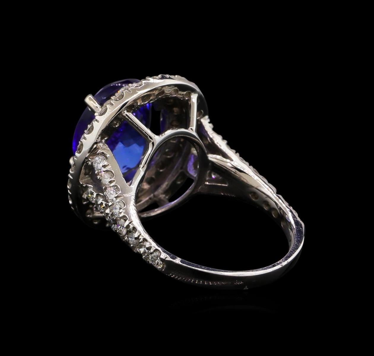 One electronically tested 14KT white gold Ladies combination cast & assembled ring with a bright polish finish. Condition is new. Identified with markings of "14K". Containing: One prong set oval modified brilliant cut natural tanzanite, measuring 12.60 x 10.00 x 6.50mm, approximate weight of 5.56ct., clarity is eye clean, type I, medium, moderately strong, bluish violet color, (GIA bV 5/4), cut is good. Colored gemstones are presumed to have been subjected to commonly used color/clarity enhancement processes. Sixty-Eight prong set round brilliant cut diamonds, measuring 1.70 - 1.70 x 1.02mm (depth est.) approximate. Total Weight of 68 Stones = 1.22ct. Clarity: I-1 to I-2. Color: I - J, Cut is Good. Total Weight of Colored Stones 5.56ct. Total Weight of Diamonds 1.22ct. Total Weight of Ring 8.00 grams. GGL Appraised.