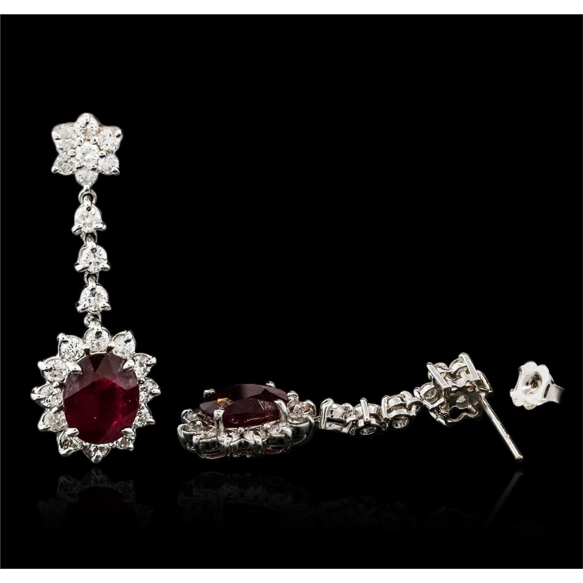 One pair of earrings featuring: 14KT white gold weighing 8.00 grams containing two rubies with a total weight of 5.56ct and round diamonds with a total weight of 4.20ct.
