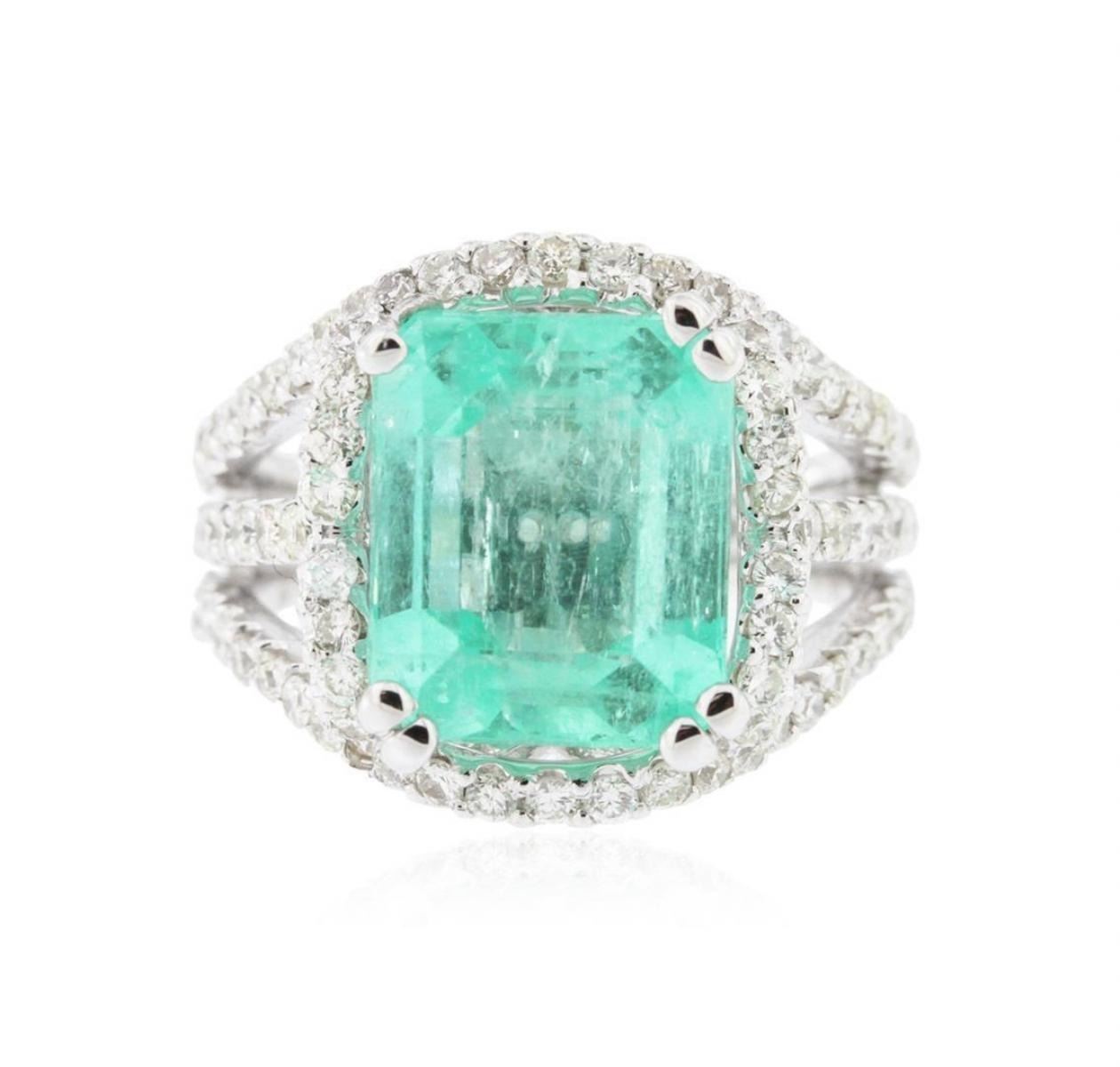 New Condition! MK9714NG. One electronically tested 14KT white gold ladies cast emerald and diamond ring with a bright polish finish. Condition is new, good workmanship. The featured emerald I set within diamond bezel, supported by split shoulders and completed by a three and one-half millimeter wide band. Identified with markings of "K14". Containing: One prong set rectangular step cut natural emerald, measuring 11.25 x 9.30 x 6.05mm, 65 bulge factor, approximate weight of 5.58ct., clarity is moderately included, type III, medium light, very slightly grayish, very slightly bluish green color, (GIA vslbG 4/3), cut is good. Transmitting light with a minimum of distortion, transparent. Naturally occurring internal & external characteristics are present. Indications of oil, & opticon residue. Colored stone grading report attached. Graded in the setting. Ninety-six prong set round brilliant cut diamonds, measuring 1.50 - 1.50 x 0.90mm (depth est.) approximate total weight of 96 stones = 1.28ct. Graded in the setting. Clarity SI-2 to I-2. Color I-J. Total weight of emerald 5.58ct. Total weight of diamonds 1.28ct. Total weight of Ring 8.70gm. AIG appraised at $10,800.00. Thank you for viewing this lot! We are always adding new inventory and new auctions, so please check back often. We appreciate your business and support. Enjoy the auction! SAA - Seized Assets Auctioneers. AIG Appraised.