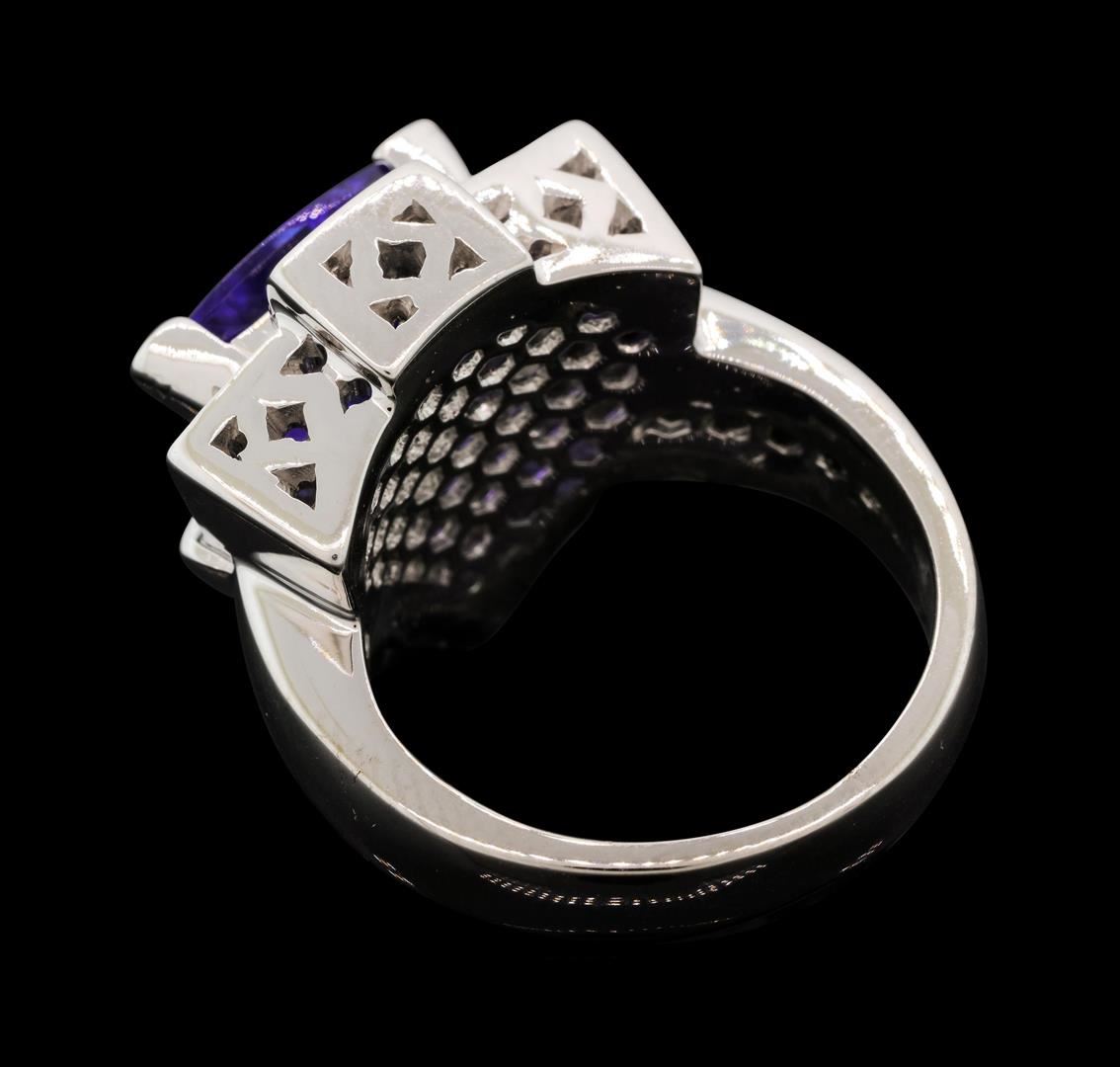 One electronically tested 14KT white gold lady's combination cast & assembled fashion ring with a cathedral shank with a basket halo with a bright polish finish. The featured lady's ring has a shank measuring 3.90 millimeters wide. Identified with markings of "14K". Condition is new, good workmanship. Containing: One prong set triangle modified brilliant cut natural tanzanite, measuring 12.90 x 12.10 x 6.00mm, (depth est.) approximate weight of 5.59ct., clarity is eye clean, medium dark, strong, violetish blue color, (GIA vB 6/5), cut is very good. Transmitting light with no distortion, transparent. Colored gemstones are presumed to have been subjected to commonly used enhancement processes. Graded in the setting. Nine channel set round brilliant cut diamonds, measuring 2.00 - 1.90 x 1.21mm (depth est.) approximate. Total Weight of 9 Stones = 0.25ct. Graded in the setting. Color H - I Clarity SI-1 to SI-2 Cut Good Fifteen prong set round brilliant cut diamonds, measuring 1.90 - 1.80 x 1.15mm (depth est.) approximate. Total Weight of 15 Stones = 0.36ct. Graded in the setting. Color H - I Clarity SI-1 to I-1 Cut Good. Total Weight of Colored Stones 5.59ct.. Total Weight of Diamonds 0.61ct.. Total Weight of Ring 16.20gm. GAS Appraised.