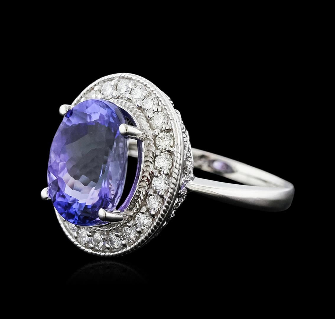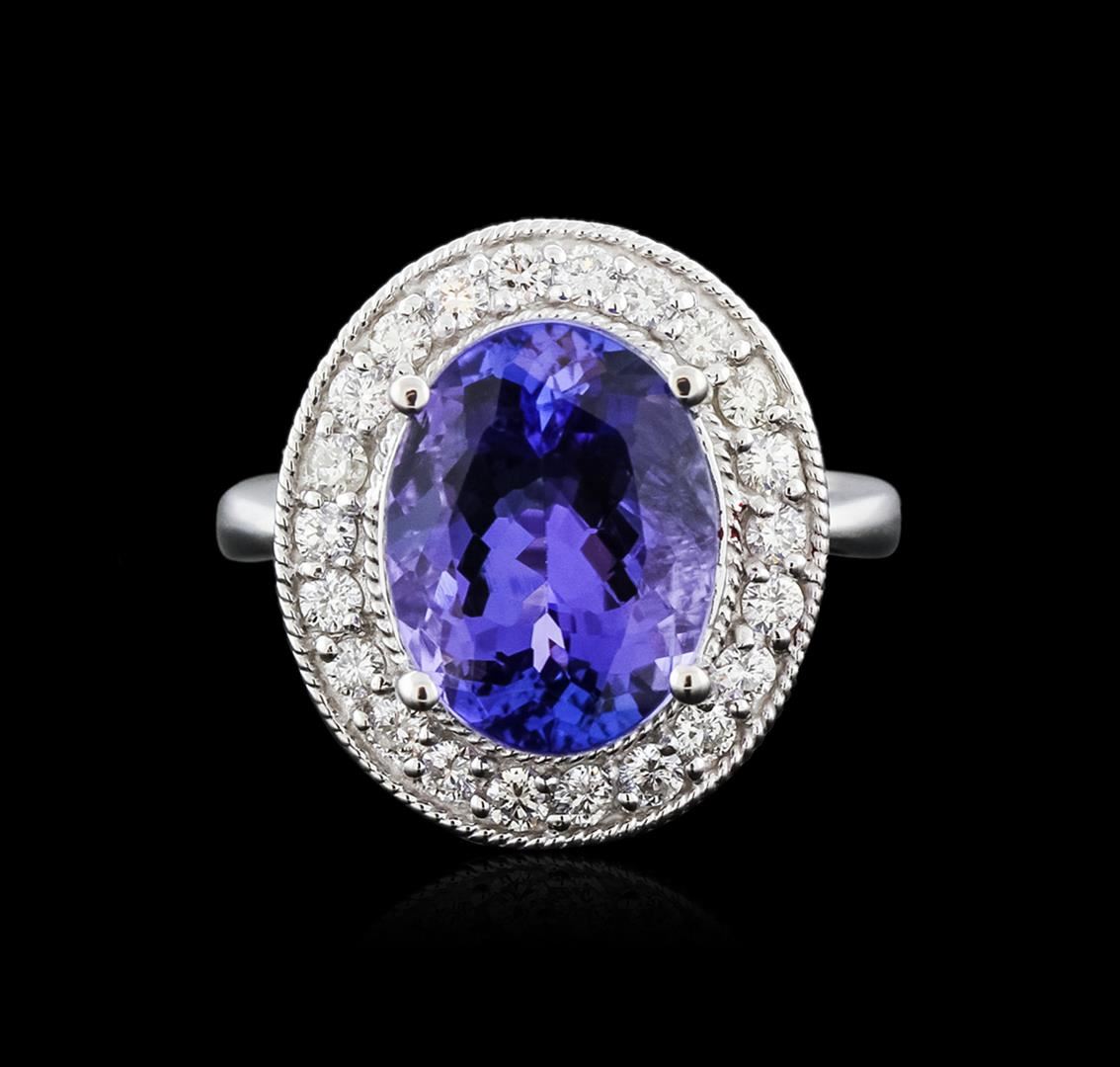 One electronically tested 14KT white gold ladies cast tanzanite and diamond ring with a bright polish finish. Identified with markings of "14K". Condition is new. Containing: One prong set oval modified brilliant cut natural tanzanite, measuring 12.56 x 9.53 x 6.66mm, approximate weight of 5.61ct., clarity is eye clean, type I, medium light, moderately strong, bluish violet color, (GIA bV 4/4), cut is good. Twenty-Two prong set round brilliant cut diamonds, measuring 1.80 - 1.80 x 1.08mm (depth est.) approximate total weight of 22 Stones = 0.47ct. Clarity: SI-1 to SI-2. Color: I - J, Cut is Good. Colored gemstones are presumed to have been subjected to commonly used enhancement processes. All diamonds and colored gemstones are graded in the mounting, unless otherwise stated. Total Weight of Colored Stones 5.61ct. Total Weight of Diamonds 0.47ct. Total Weight of Ring 6.70 grams. GGL Appraised at $6,160.00.