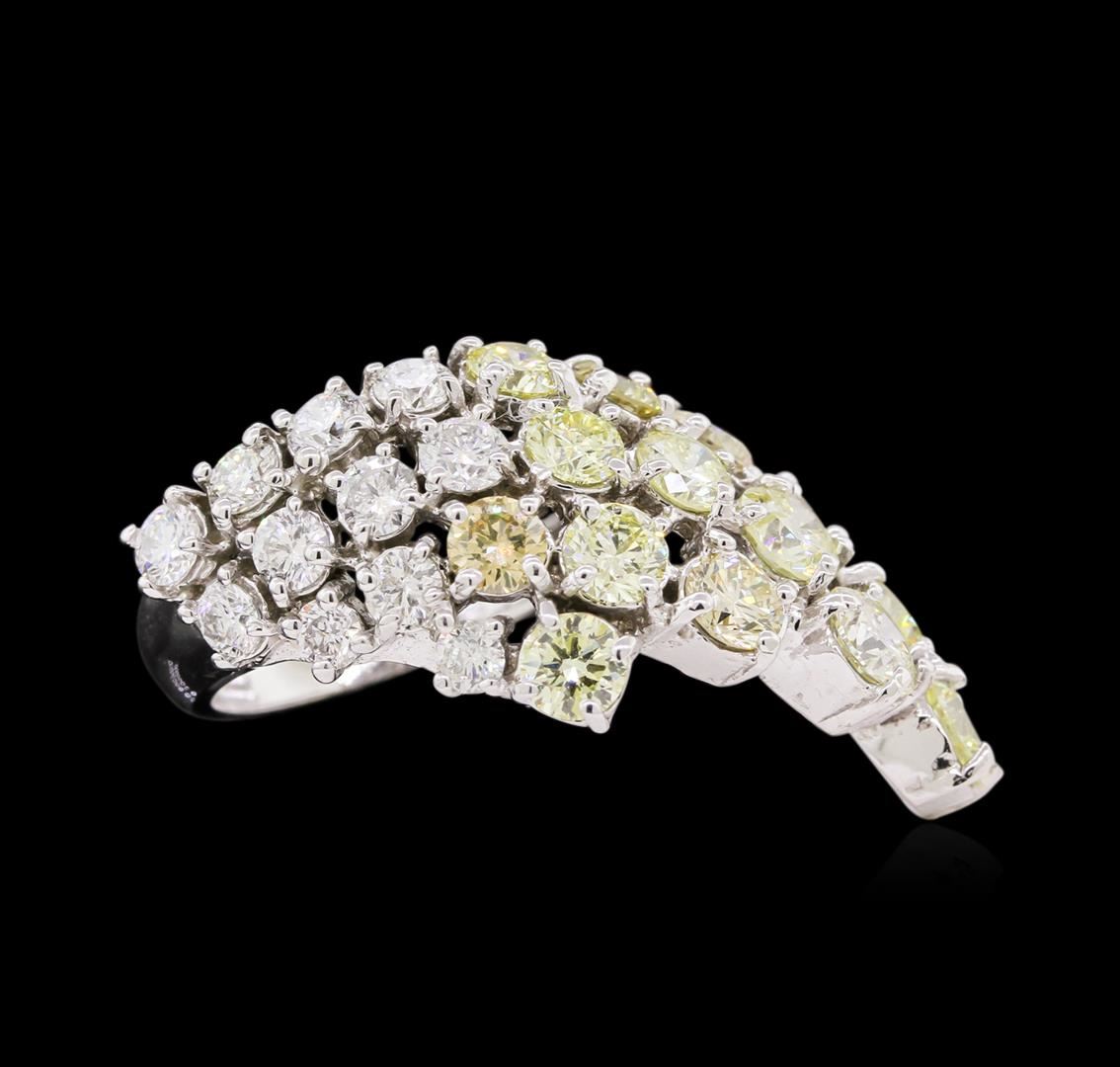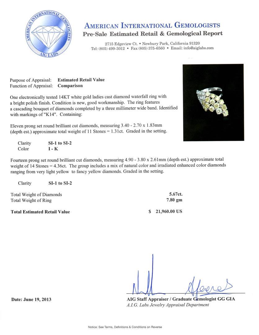 One electronically tested 14KT white gold ladies cast diamond waterfall ring with a bright polish finish. Condition is new, good workmanship. The ring features a cascading bouquet of diamonds completed by a three millimeter wide band. Identified with markings of "K14". Containing: Eleven prong set round brilliant cut diamonds, measuring 3.40 -- 2.70 x 1.83mm (depth est.) approximate total weight of 11 stones = 1.31ct. Graded in the setting. Clarity SI-1 to SI-2. Color I-K. Fourteen prong set round brilliant cut diamonds, measuring 4.90 -- 3.80 x 2.61mm (depth est.) approximate total weight of 14 stones = 4.36ct. The group includes a mix of natural color and irradiated enhanced color diamonds ranging from very light yellow to fancy yellow diamonds, Graded in the setting. Clarity SI-1 to SI-2. Total weight of Diamonds 5.67ct. Total weight of Ring 7.80gm. AIG Appraised at $21,960.00.