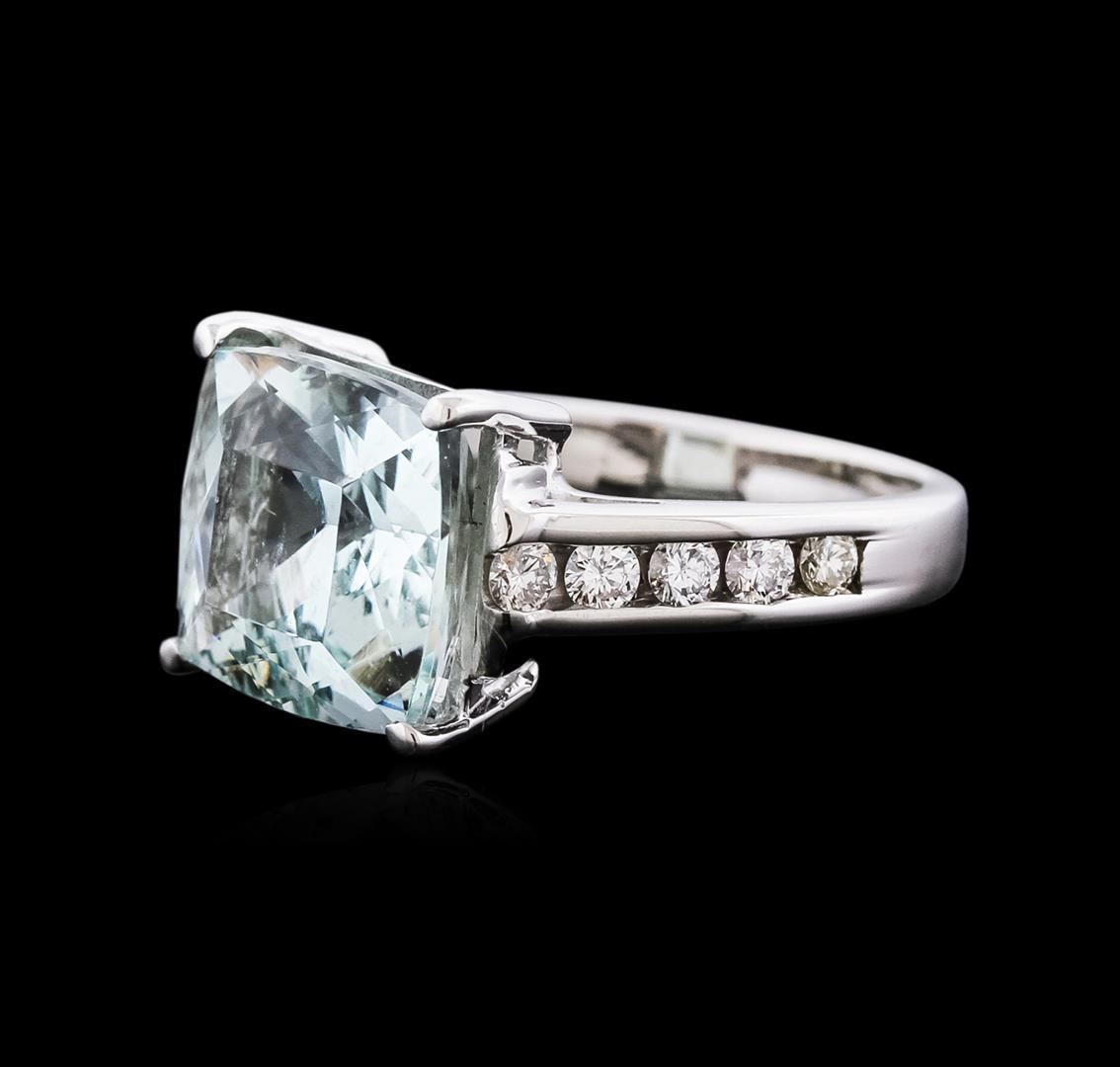 One ring featuring: 14KT white gold weighing 6.45 grams containing one princess cut aquamarine center weighing 5.70ct and round cut diamonds weighing a total of 0.35ct.