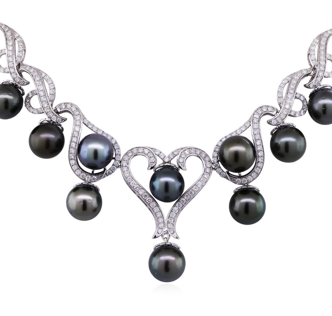 One electronically tested 14KT white gold ladies cast & assembled tahitian cultured pearl and diamond necklace. Seventeen and one-half inch length necklace features a stylized tahitian cultured pearl fringe supported by an elaborate diamond set ribbon transitioning into matching white gold links, terminating in a concealed clasp with safety. Bright polish finish. Trademark is Orianne. Identified with markings of "14K". Condition is new, good workmanship. Containing: Ten Tahitian pearls, 10.5mm in size to 11.0mm in size. The pearls are black in color with a good luster, round, lightly blemished Graded in the setting.Tahitian cultured pearls form in the large "Black Lipped" Pinctada Margaritifera oyster, which is about twice the size of the Japanese Akoya oyster. This warm water species from across the central and South Pacific Ocean is at home in the bays and lagoons of the islands & atolls of French Polynesia. Tahitian cultured pearl farmers generally raise their oysters in lagoons.Tahitian cultured pearls take from two to four years to form. Black pearls are known for their iridescent, vibrant, almost metallic natural colors, unique among saltwater cultured pearls. Though commonly called "Tahitian" pearls, they are actually gray, to a lighter or darker degree. Tahitian pearls have the unique ability to display a variety of colors at the same time, which can be seen glistening on their surface. Three Hundred Nineteen prong set round brilliant cut diamonds approximate. Total Weight of 319 Stones = 5.71ct. Graded in the setting. Clarity: I-1 to I-2. Color: F - H. Total Weight of Diamonds 5.71ct. Total Weight of Necklace 46.46gm. AIG Appraised at $26,315.00.