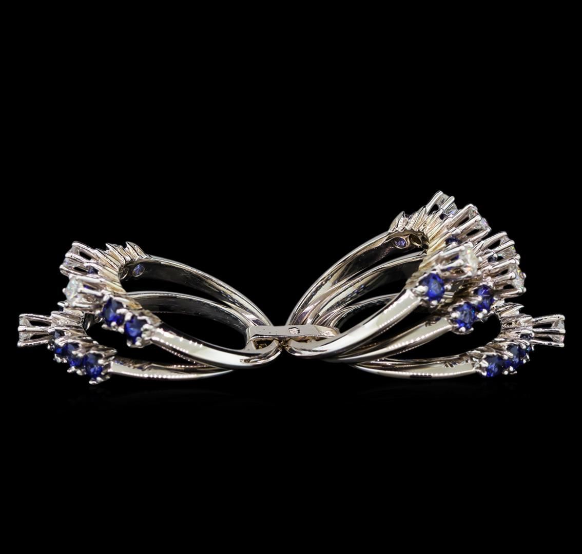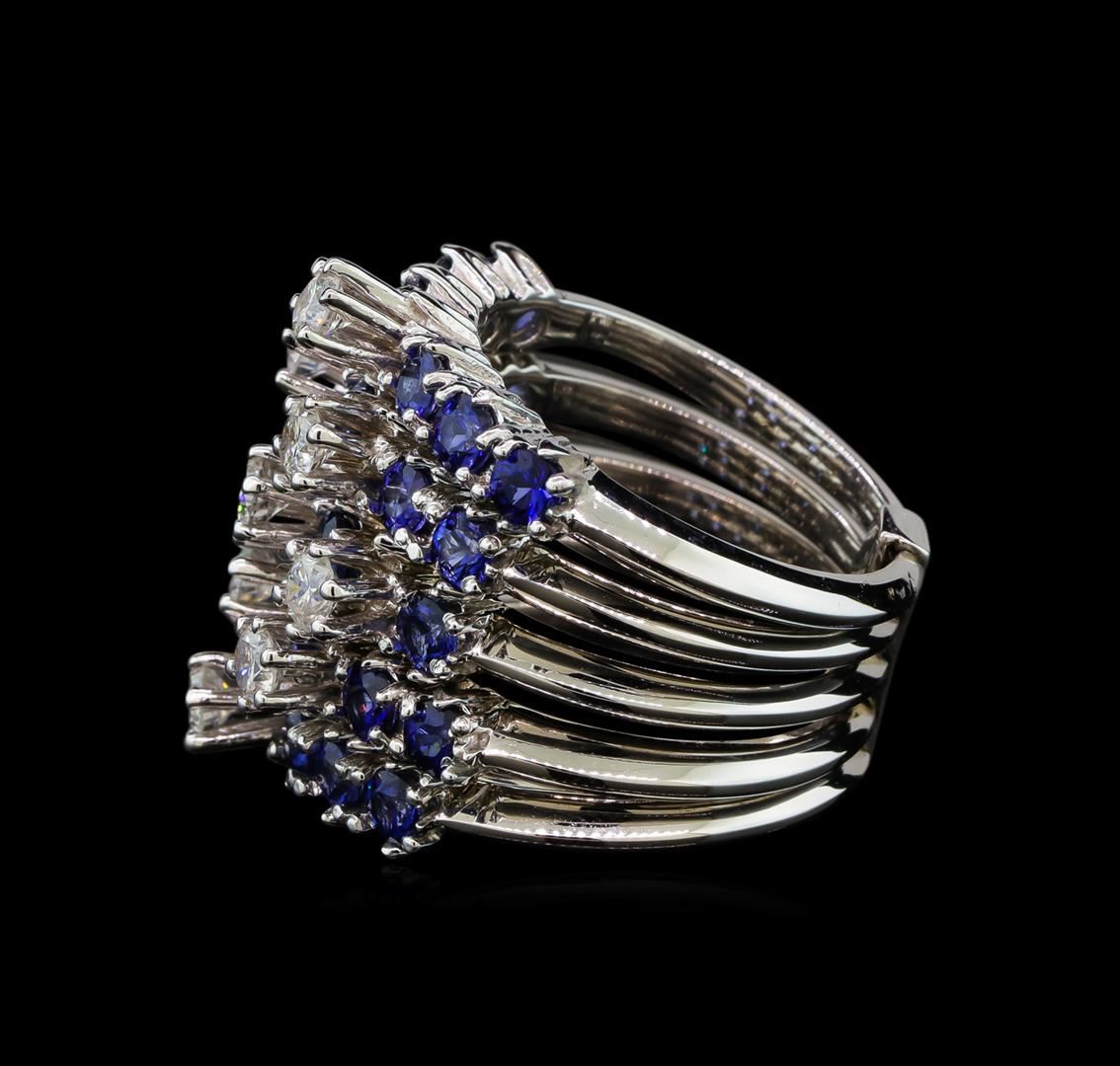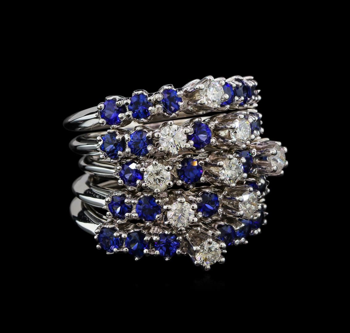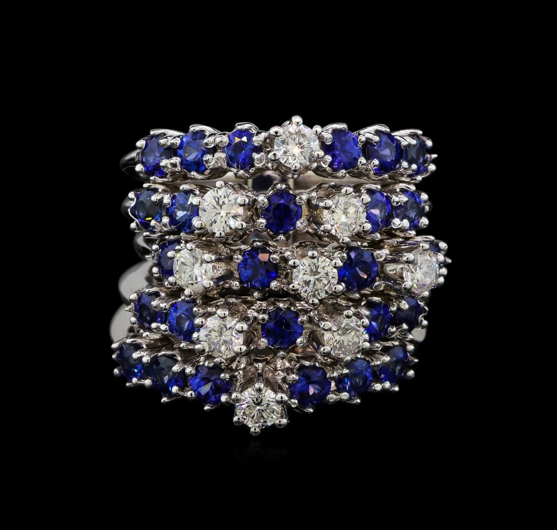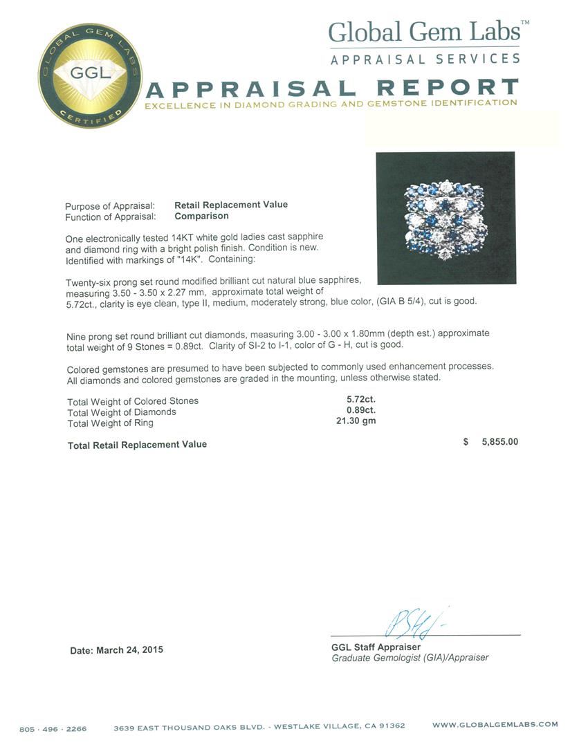 One electronically tested 14KT white gold ladies cast sapphire and diamond ring with a bright polish finish. Identified with markings of "14K". Condition is new. Containing: Twenty-six prong set round modified brilliant cut natural blue sapphires, measuring 3.50 - 3.50 x 2.27 mm, approximate total weight of 5.72ct., clarity is eye clean, type II, medium, moderately strong, blue color, (GIA B 5/4), cut is good. Nine prong set round brilliant cut diamonds, measuring 3.00 - 3.00 x 1.80mm (depth est.) approximate total weight of 9 Stones = 0.89ct. Clarity: SI-2 to I-1. Color: G - H, Cut is Good. Colored gemstones are presumed to have been subjected to commonly used enhancement processes. All diamonds and colored gemstones are graded in the mounting, unless otherwise stated. Total Weight of Colored Stones 5.72ct. Total Weight of Diamonds 0.89ct. Total Weight of Ring 21.30 grams. GGL Appraised at $5,855.00.