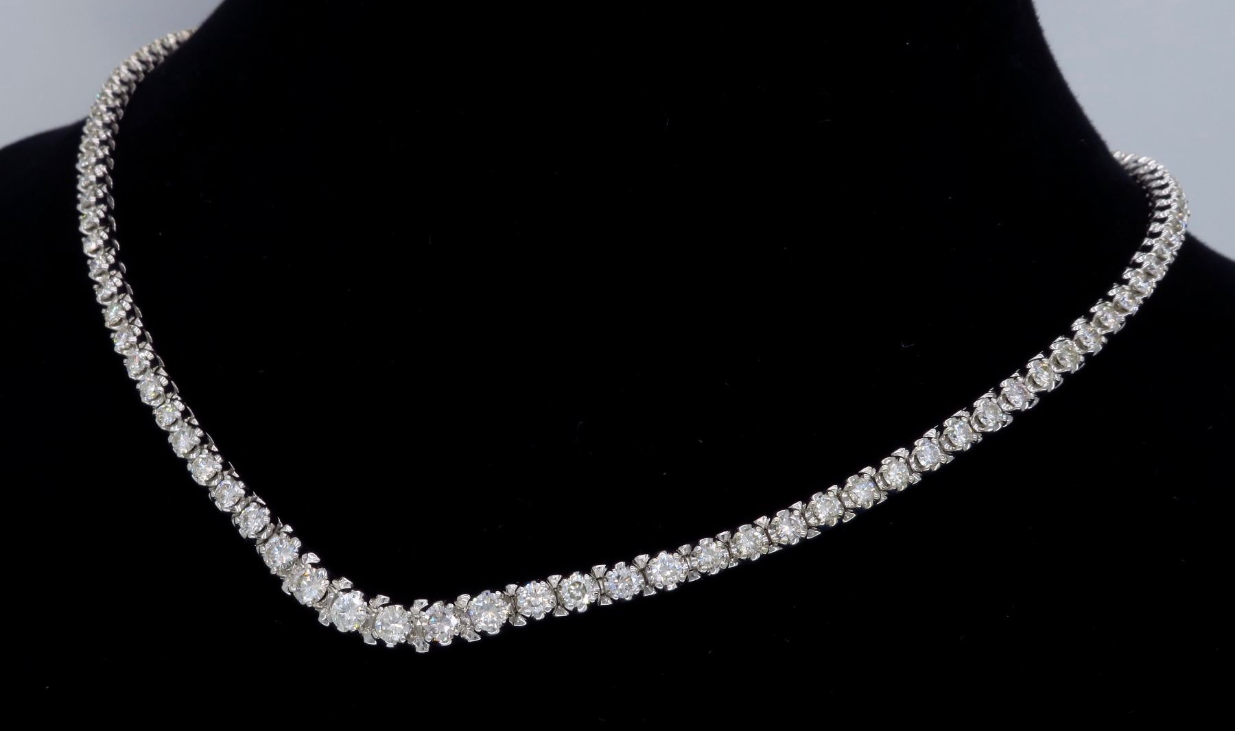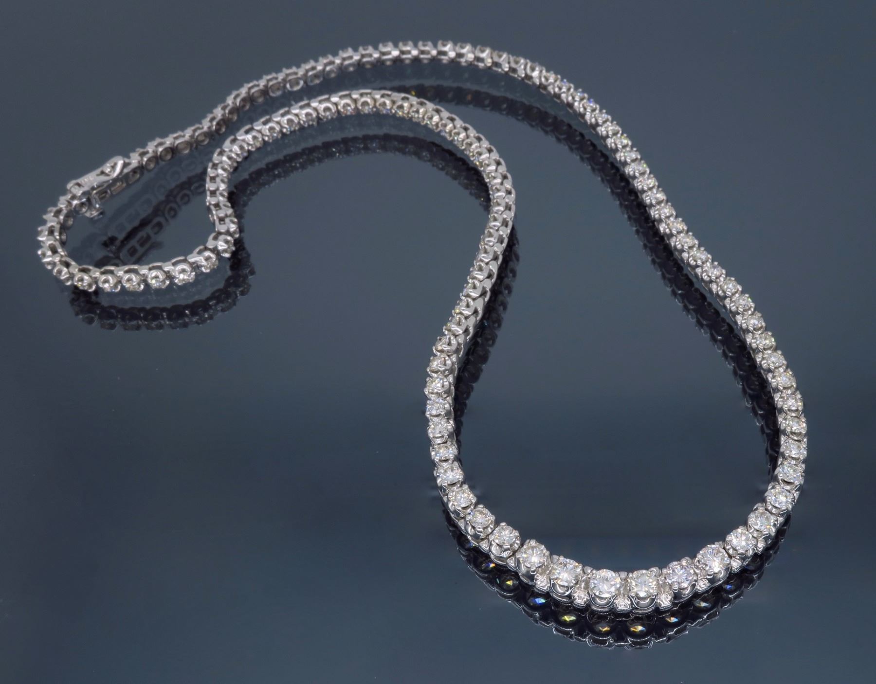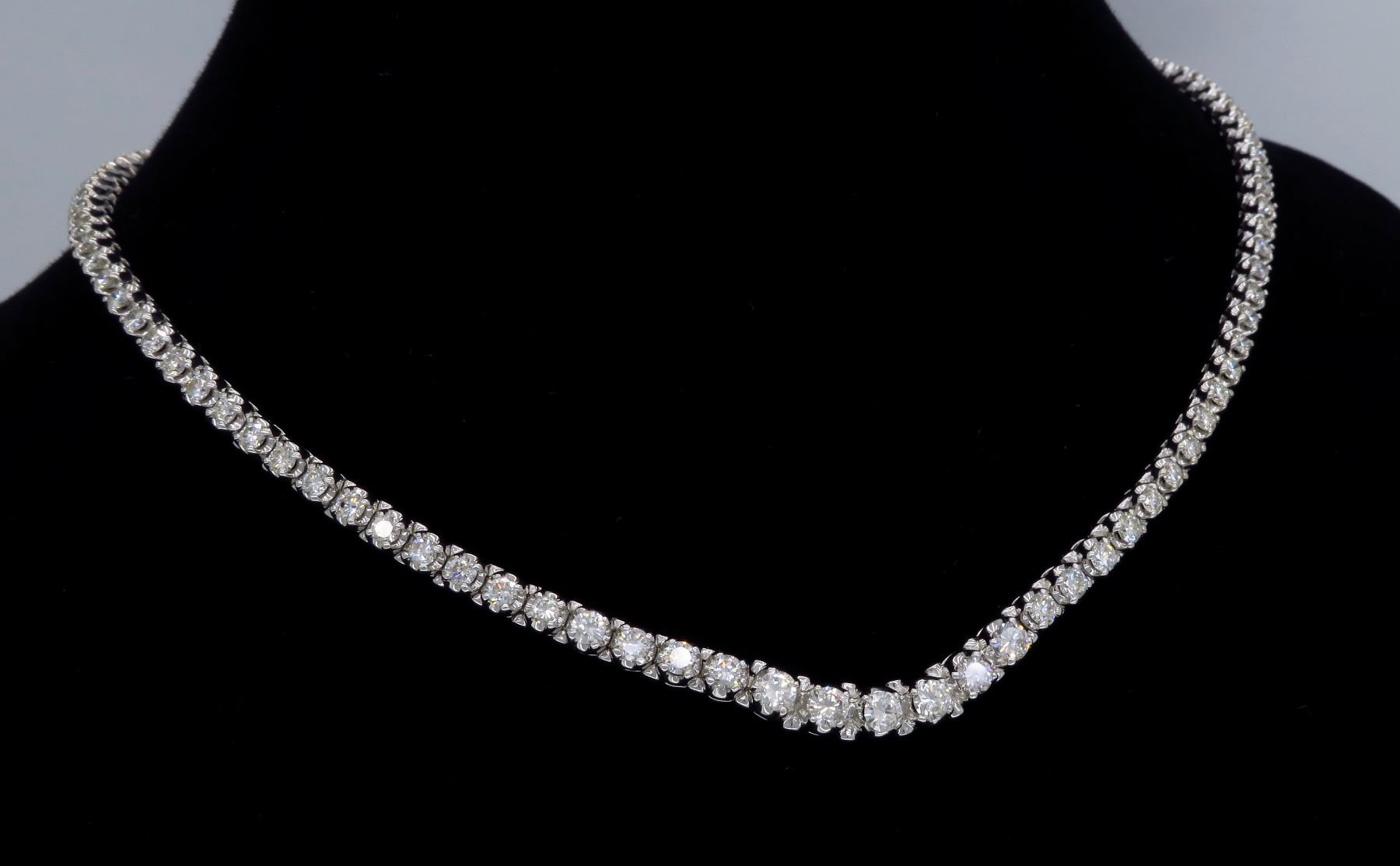 One 14KT White Gold 5.75ctw Diamond Necklace. Round Diamonds with a total weight of 5.75cts with a color of G-I and clarity of VS-1 to SI-2. Total weight of this necklace is 31.1 grams. The total length of this necklace is 17.5 inches.