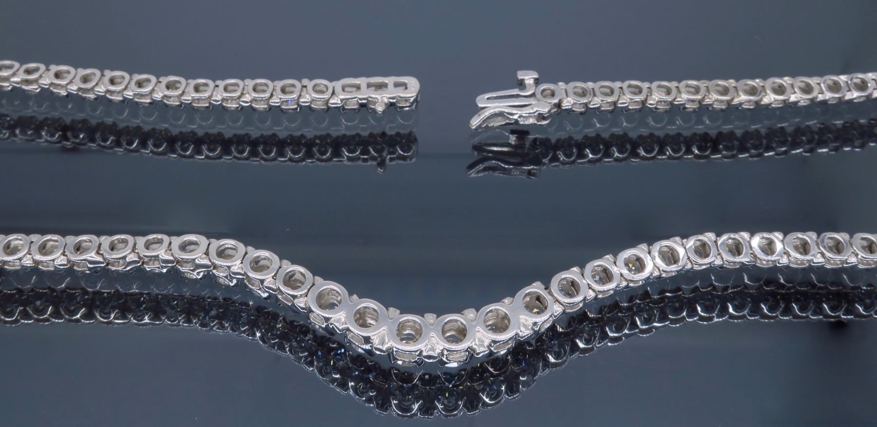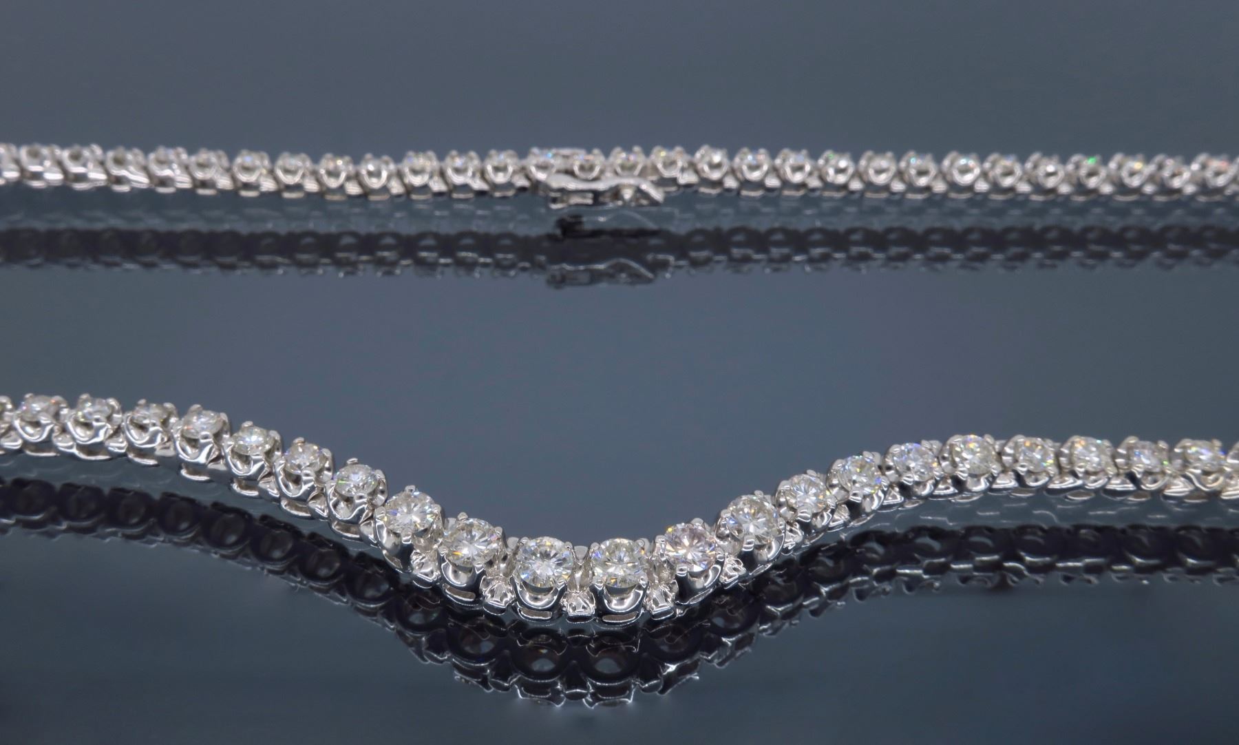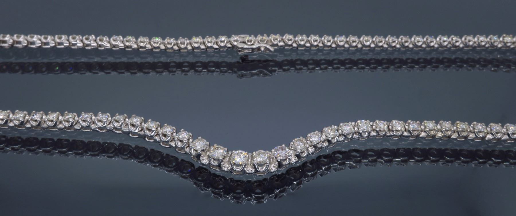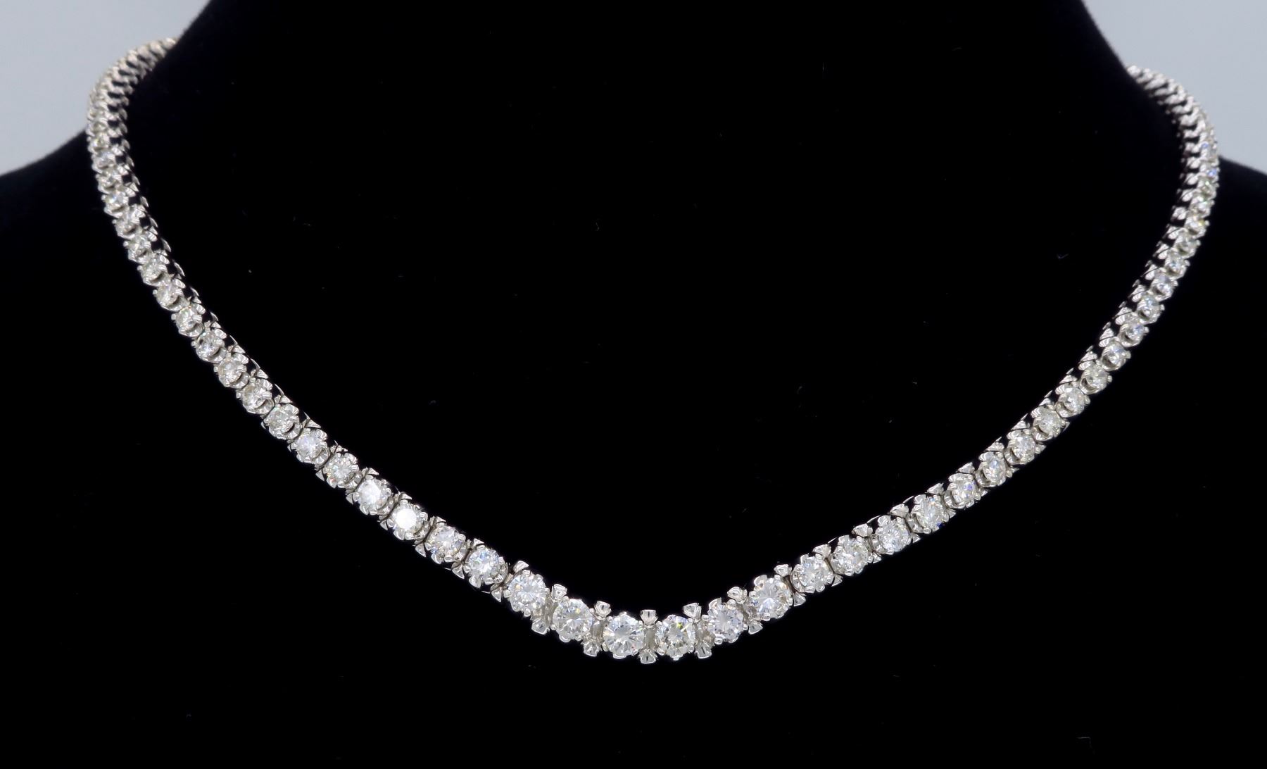 One 14KT White Gold 5.75ctw Diamond Necklace. Round Diamonds with a total weight of 5.75cts with a color of G-I and clarity of VS-1 to SI-2. Total weight of this necklace is 31.1 grams. The total length of this necklace is 17.5 inches.