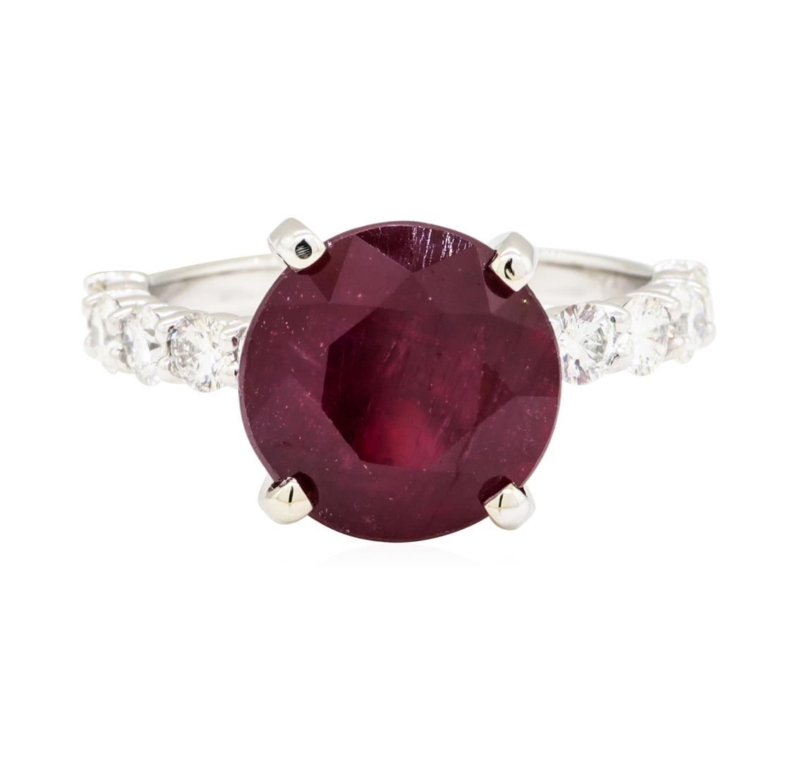 One electronically tested 14KT white gold lady's cast fashion ring with a bright polish finish. The featured lady's ring has a shank measuring 1.95 millimeters wide. Identified with markings of '14K'. Condition is new, good workmanship. Containing: One prong set round modified mixed cut natural ruby-glass composite, measuring 10.51 - 10.50 x 6.60 mm, (depth est.) approximate weight of 5.80ct., clarity is heavily included, medium dark, moderately strong, red color, (GIA R 6/4), cut is good. Transmitting light somewhat diffusely, semi-transparent to translucent. Naturally occurring internal & external characteristics are present. Indications of laboratory high temperature heat treatment, with glass & flux additives. Colored gemstones are presumed to have been subjected to commonly used enhancement processes. Graded in the setting. Ten prong set round brilliant cut diamonds, measuring 2.70 - 2.65 x 1.66mm (depth est.) approximate total weight of 10 Stones = 0.75ct. Graded in the setting. Color G - H Clarity VS-2 to SI-1 Cut Very Good. Total Weight of Colored Stones 5.80ct.. Total Weight of Diamonds 0.75ct.. Total Weight of Ring 4.20gm. GAS Appraised.