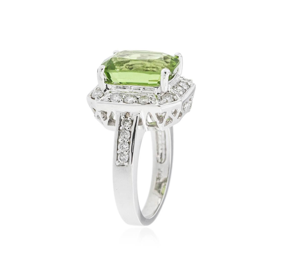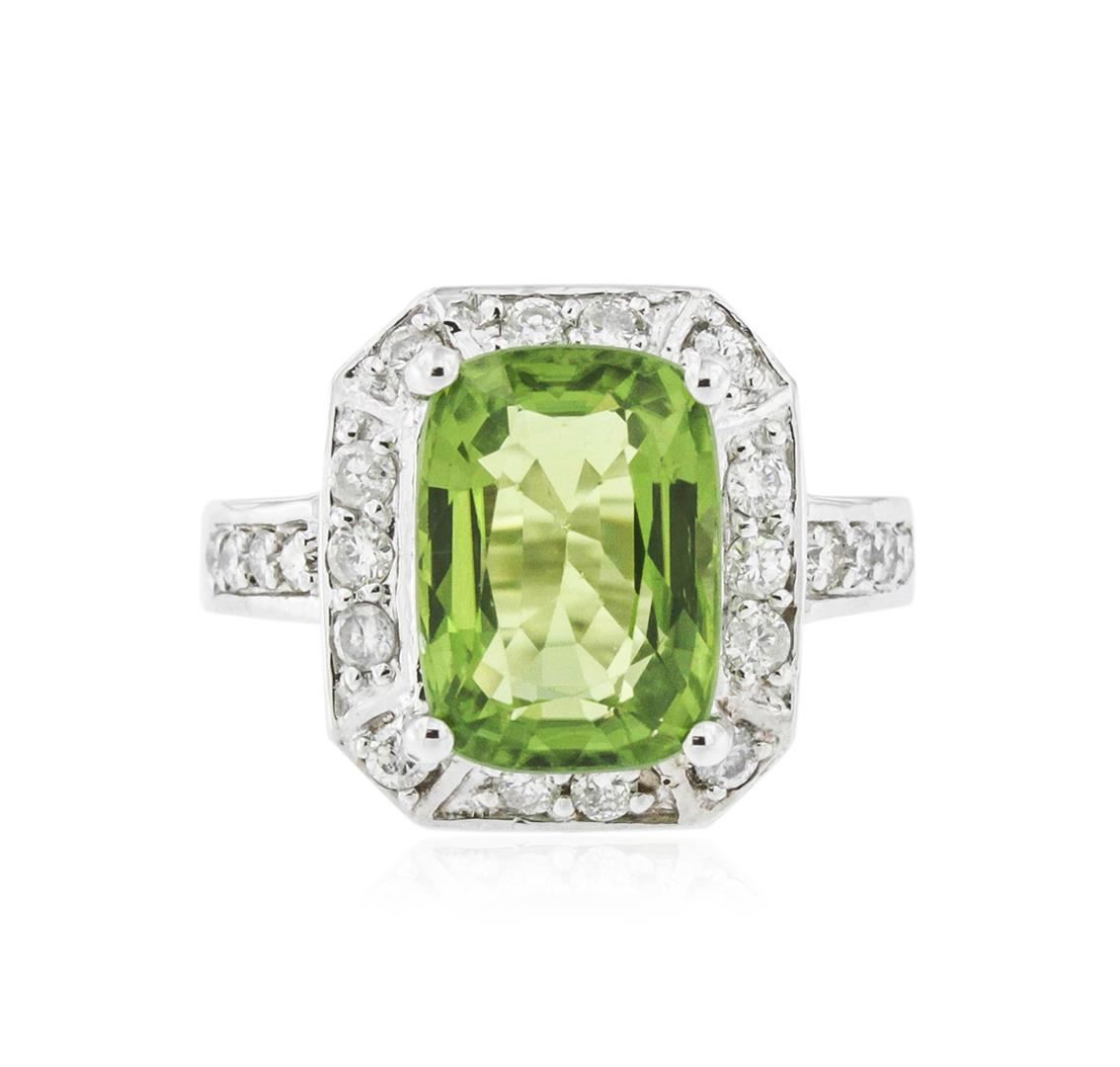 One polished, stamped, and tested solid 14K white gold ring mounted with: 1 genuine peridot weighing 5.81 carat, and 22 genuine round diamonds weighing 0.65 carats. This item weighs 8.8 grams, condition is new, excellent workmanship. MAIN GEMSTONE: Identity: Natural Peridot. Species: Peridot. Shape: Cushion. Cutting Style: Brilliant Cut Crown Step Cut Pavilion. Measurements: 12.20 x 8.61 x 6.03 mm. Weight: 5.81 carats. Color: Yellowish Green. Cut Grade: Very Good. Refractive Index: 1.654 to 1.690 (+/-0.020) DR. Birefringence: 0.035 - 0.038. Hardness: 6.5-. ADJACENT GEMSTONES ON RING: Identity: Natural Diamond. Shape: Round. Cutting Style: Brilliant Cut. Quantity: 22 Diamonds. Measurements: 1.8 - 2.0 mm. Total Weight: 0.65 carats. Clarity Grade: SI1 - SI3. Color Grade: F - H. Refractive Index: 2.418. Hardness: 10. Peridot Weight: 5.81ct. Total Diamond Weight: 0.65cts. Weight of Item: 8.8 grams. Gold Content: 14K White Gold. AIGL Appraised at $6,750.00.