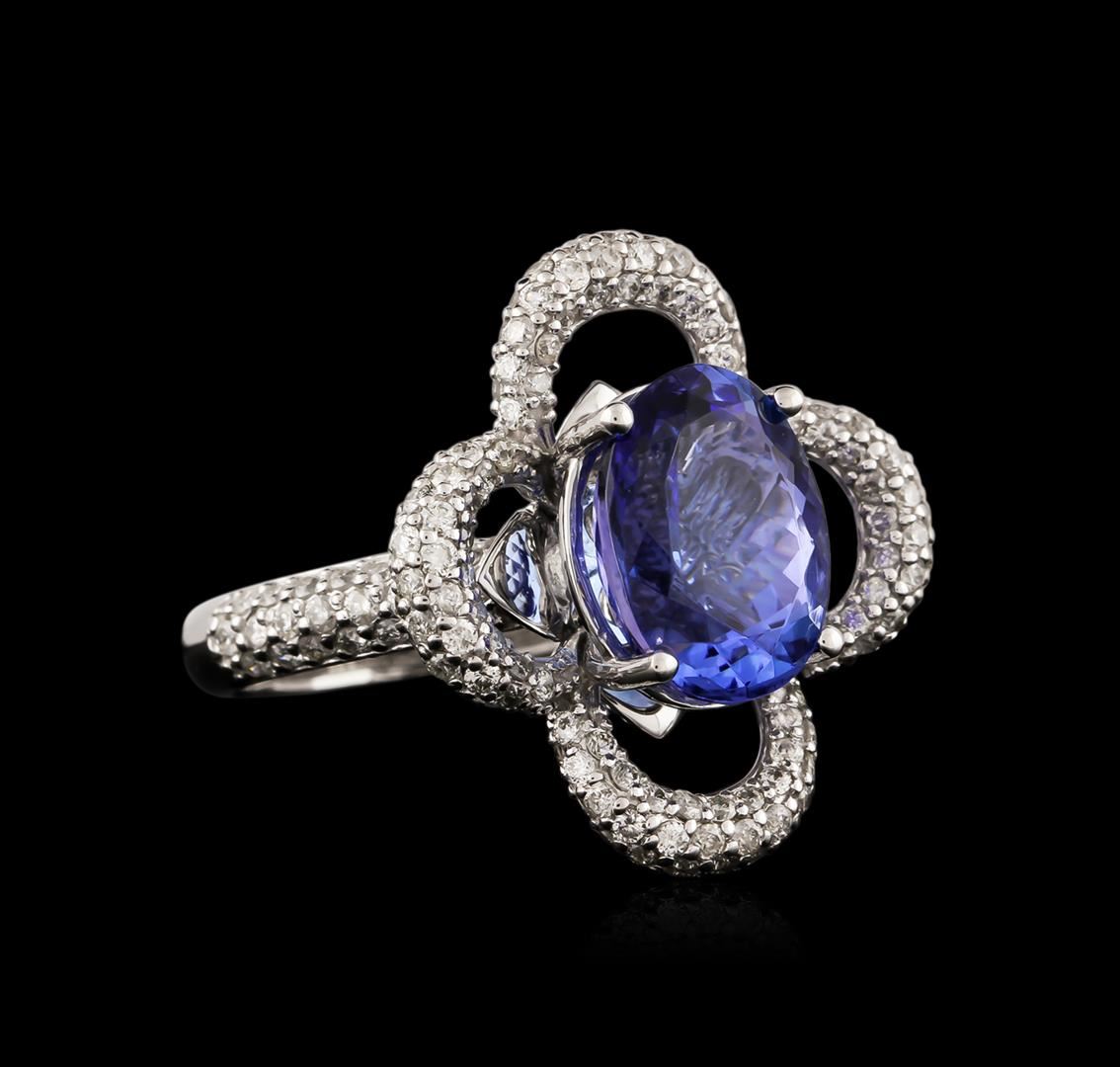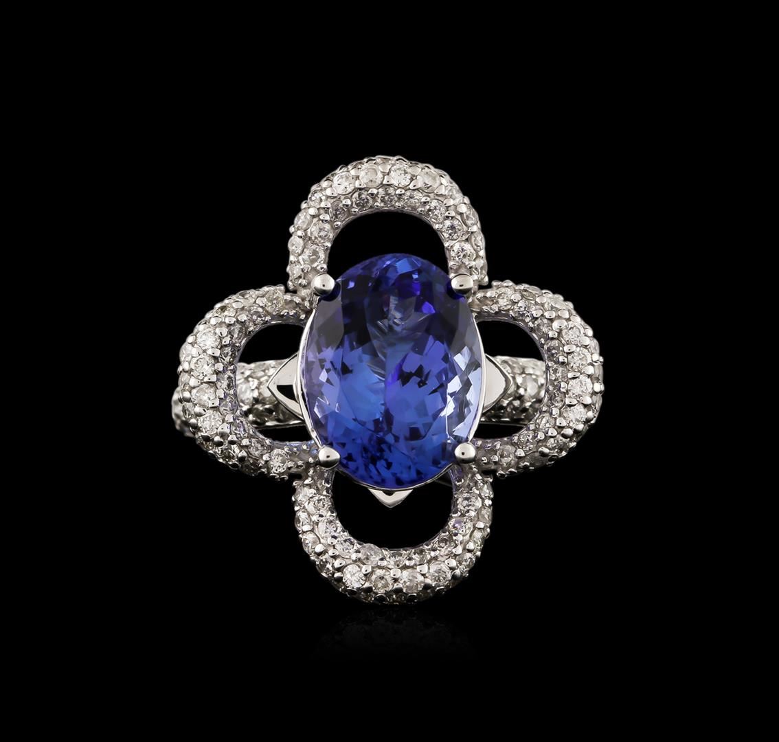 One electronically tested 14KT white gold ladies cast tanzanite and diamond ring with a bright polish finish. Identified with markings of "14K". Condition is new. Containing: One prong set emerald standard step cut natural tanzanite, measuring 11.10 x 8.20 x 7.06mm, approximate weight of 5.81ct., clarity is eye clean, type I, medium light, very slightly grayish, violet color, (GIA V 4/3), cut is good. One Hundred Seventy-Six prong set round brilliant cut diamonds, measuring 1.30 - 1.30 x 0.78mm (depth est.) approximate total weight of 176 Stones = 1.41ct. Clarity of SI-2 to I-2, Color of I - J, Cut is Good. Colored gemstones are presumed to have been subjected to commonly used enhancement processes. All diamonds and colored gemstones are graded in the mounting, unless otherwise stated. Total Weight of Colored Stones 5.81ct. Total Weight of Diamonds 1.41ct. Total Weight of Ring 7.20 grams. GGL Appraised at $7,665.00.