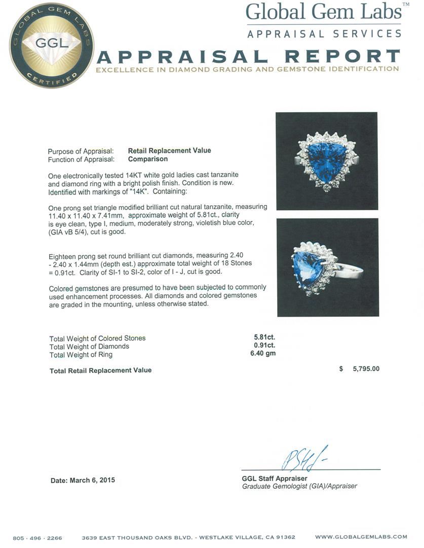 One electronically tested 14KT white gold ladies cast tanzanite and diamond ring with a bright polish finish. Identified with markings of "14K". Condition is new. Containing: One prong set triangle modified brilliant cut natural tanzanite, measuring 11.40 x 11.40 x 7.41mm, approximate weight of 5.81ct., clarity is eye clean, type I, medium, moderately strong, violetish blue color, (GIA vB 5/4), cut is good. Eighteen prong set round brilliant cut diamonds, measuring 2.40 - 2.40 x 1.44mm (depth est.) approximate total weight of 18 Stones = 0.91ct. . Clarity: SI-1 to SI-2. Color: I - J, Cut is Good. Colored gemstones are presumed to have been subjected to commonly used enhancement processes. All diamonds and colored gemstones are graded in the mounting, unless otherwise stated.. Total Weight of Colored Stones 5.81ct.. Total Weight of Diamonds 0.91ct.. Total Weight of Ring 6.40 grams. GGL Appraised at $5,795.00.