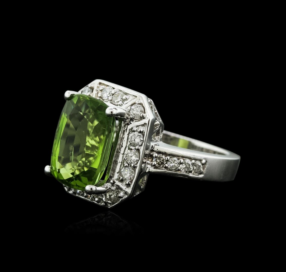 One polished, stamped, and tested solid 14K white gold ring mounted with: 1 genuine peridot weighing 5.81 carat, and 22 genuine round diamonds weighing 0.65 carats. This item weighs 8.8 grams, condition is new, excellent workmanship. MAIN GEMSTONE: Identity: Natural Peridot. Species: Peridot. Shape: Cushion. Cutting Style: Brilliant Cut Crown Step Cut Pavilion. Measurements: 12.20 x 8.61 x 6.03 mm. Weight: 5.81 carats. Color: Yellowish Green. Cut Grade: Very Good. Refractive Index: 1.654 to 1.690 (+/-0.020) DR. Birefringence: 0.035 - 0.038. Hardness: 6.5-. ADJACENT GEMSTONES ON RING: Identity: Natural Diamond. Shape: Round. Cutting Style: Brilliant Cut. Quantity: 22 Diamonds. Measurements: 1.8 - 2.0 mm. Total Weight: 0.65 carats. Clarity Grade: SI1 - SI3. Color Grade: F - H. Refractive Index: 2.418. Hardness: 10. Peridot Weight: 5.81ct. Total Diamond Weight: 0.65cts. Weight of Item: 8.8 grams. Gold Content: 14K White Gold. AIGL Appraised at $6,750.00.
