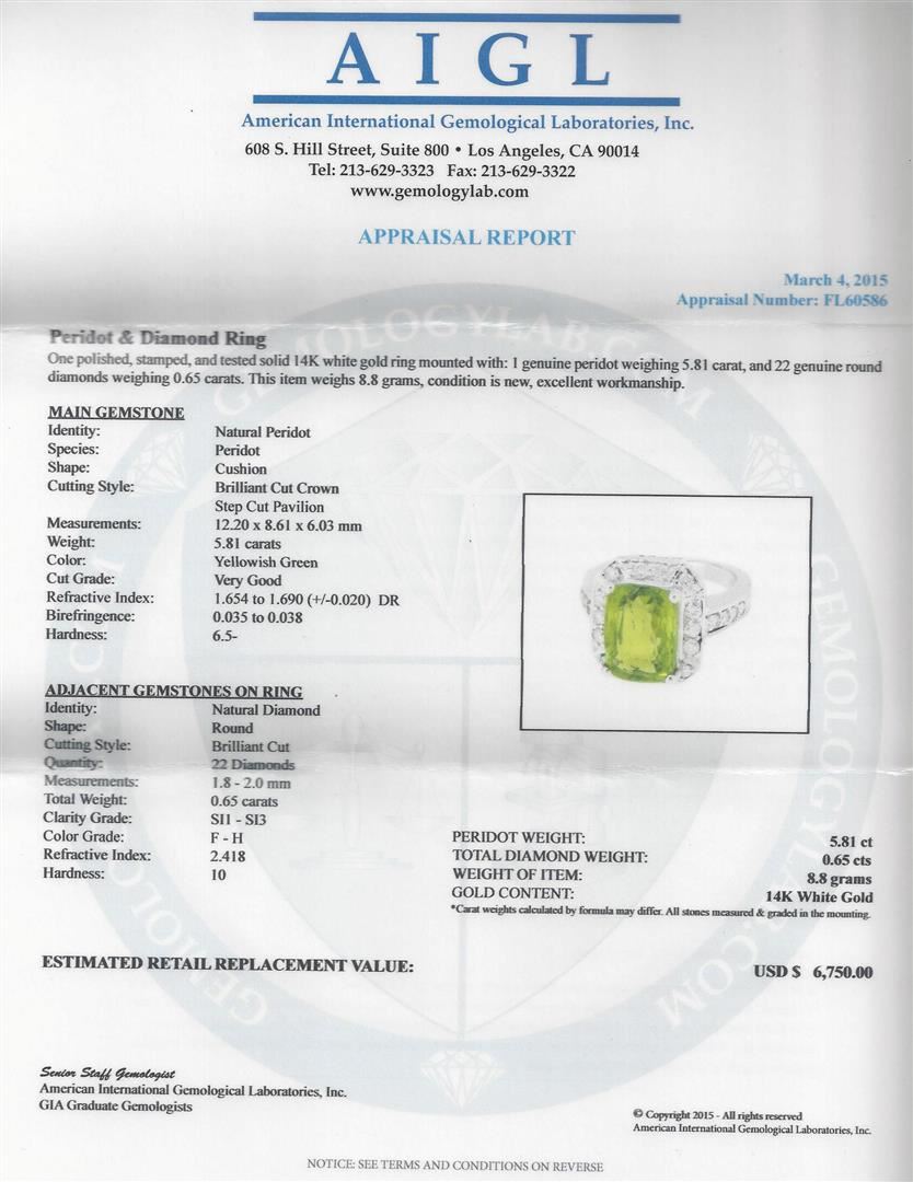 One polished, stamped, and tested solid 14K white gold ring mounted with: 1 genuine peridot weighing 5.81 carat, and 22 genuine round diamonds weighing 0.65 carats. This item weighs 8.8 grams, condition is new, excellent workmanship. MAIN GEMSTONE: Identity: Natural Peridot. Species: Peridot. Shape: Cushion. Cutting Style: Brilliant Cut Crown Step Cut Pavilion. Measurements: 12.20 x 8.61 x 6.03 mm. Weight: 5.81 carats. Color: Yellowish Green. Cut Grade: Very Good. Refractive Index: 1.654 to 1.690 (+/-0.020) DR. Birefringence: 0.035 - 0.038. Hardness: 6.5-. ADJACENT GEMSTONES ON RING: Identity: Natural Diamond. Shape: Round. Cutting Style: Brilliant Cut. Quantity: 22 Diamonds. Measurements: 1.8 - 2.0 mm. Total Weight: 0.65 carats. Clarity Grade: SI1 - SI3. Color Grade: F - H. Refractive Index: 2.418. Hardness: 10. Peridot Weight: 5.81ct. Total Diamond Weight: 0.65cts. Weight of Item: 8.8 grams. Gold Content: 14K White Gold. AIGL Appraised at $6,750.00.