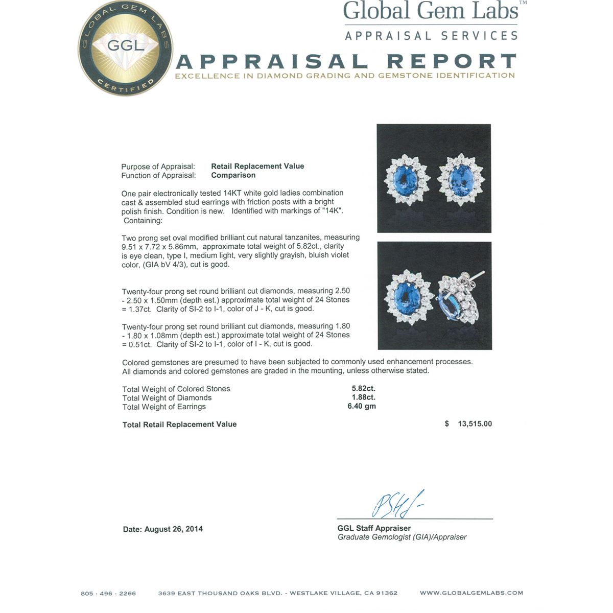 One pair electronically tested 14KT white gold ladies combination cast & assembled stud earrings with friction posts with a bright polish finish. Identified with markings of "14K". Condition is new. Containing: Two prong set oval modified brilliant cut natural tanzanites, measuring 9.51 x 7.72 x 5.86mm, approximate total weight of 5.82ct., clarity is eye clean, type I, medium light, very slightly grayish, bluish violet color, (GIA bV 4/3), cut is good. Twenty-Four prong set round brilliant cut diamonds, measuring 2.50 - 2.50 x 1.50mm (depth est.) approximate total weight of 24 Stones = 1.37ct. Clarity: SI-2 to I-1. Color: J - K, Cut is Good. Twenty-Four prong set round brilliant cut diamonds, measuring 1.80 - 1.80 x 1.08mm (depth est.) approximate total weight of 24 Stones = 0.51ct. Clarity: SI-2 to I-1. Color: I - K, Cut is Good. Colored gemstones are presumed to have been subjected to commonly used enhancement processes. All diamonds and colored gemstones are graded in the mounting, unless otherwise stated. Total Weight of Colored Stones 5.82ct. Total Weight of Diamonds 1.88ct. Total Weight of Earrings 6.40 grams. GGL Appraised at $13,515.00.