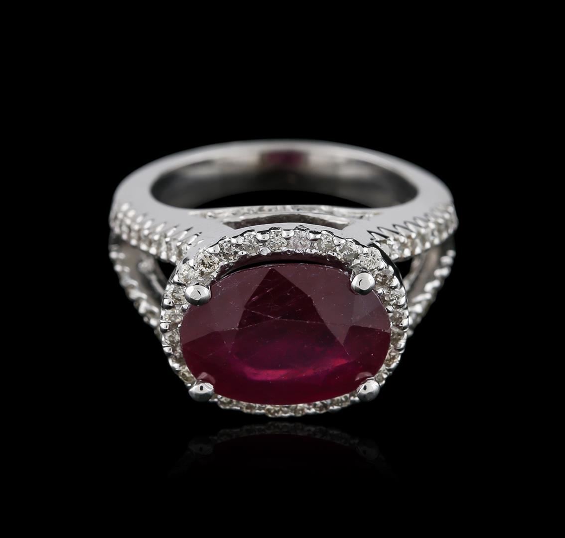 One electronically tested 14KT white gold ladies cast ruby and diamond ring with a half round shank with a bright polish finish. Identified with markings of "K14". Condition is new. Containing: One prong set oval modified brilliant cut natural ruby, measuring 13.01 x 9.54 x 5.61mm, approximate weight of 5.85ct., clarity is heavily included, type II, medium dark, moderately strong, strongly purplish red color, (GIA stpR 6/4), cut is good. Seventy-Four prong set round brilliant cut diamonds, measuring 1.30 - 1.30 x 0.78mm (depth est.) approximate total weight of 74 Stones = 0.59ct. Clarity: SI-1 to I-1. Color: H - I, Cut is Good. All diamonds and colored gemstones are graded in the mounting, unless otherwise stated. Colored gemstones are presumed to have been subjected to commonly used enhancement processes. Total Weight of Colored Stones 5.85ct. Total Weight of Diamonds 0.59ct. Total Weight of Ring 9.00 grams. GGL Appraised at $4,250.00.