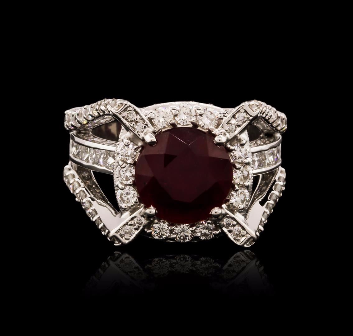 One electronically tested 14KT white gold ladies cast ruby and diamond ring with a bright polish finish. Identified with markings of "14K". Condition is new. Containing: One prong set round modified brilliant cut natural ruby, measuring 10.40 - 10.40 x 6.76 mm, approximate weight of 5.85ct., clarity is heavily included, type II, medium dark, moderately strong, strongly purplish red color, (GIA stpR 6/4), cut is good. One Hundred Forty-Four prong set round brilliant cut diamonds, measuring 1.50 - 1.50 x 0.90mm (depth est.) approximate total weight of 144 Stones = 1.77ct. Clarity: SI-2 to I-1. Color: J - L, Cut is Good. Eighteen channel set princess cut diamonds, measuring 2.50 x 2.50 x 1.88mm (depth est.) approximate total weight of 18 Stones = 1.73ct. Clarity: SI-1. Color: J - K, Cut is Good. Colored gemstones are presumed to have been subjected to commonly used enhancement processes, All diamonds and colored gemstones are graded in the mounting, unless otherwise stated. Total Weight of Colored Stones 5.85ct. Total Weight of Diamonds 3.50ct. Total Weight of Ring 16.90 grams. GGL Appraised at $10,335.00.