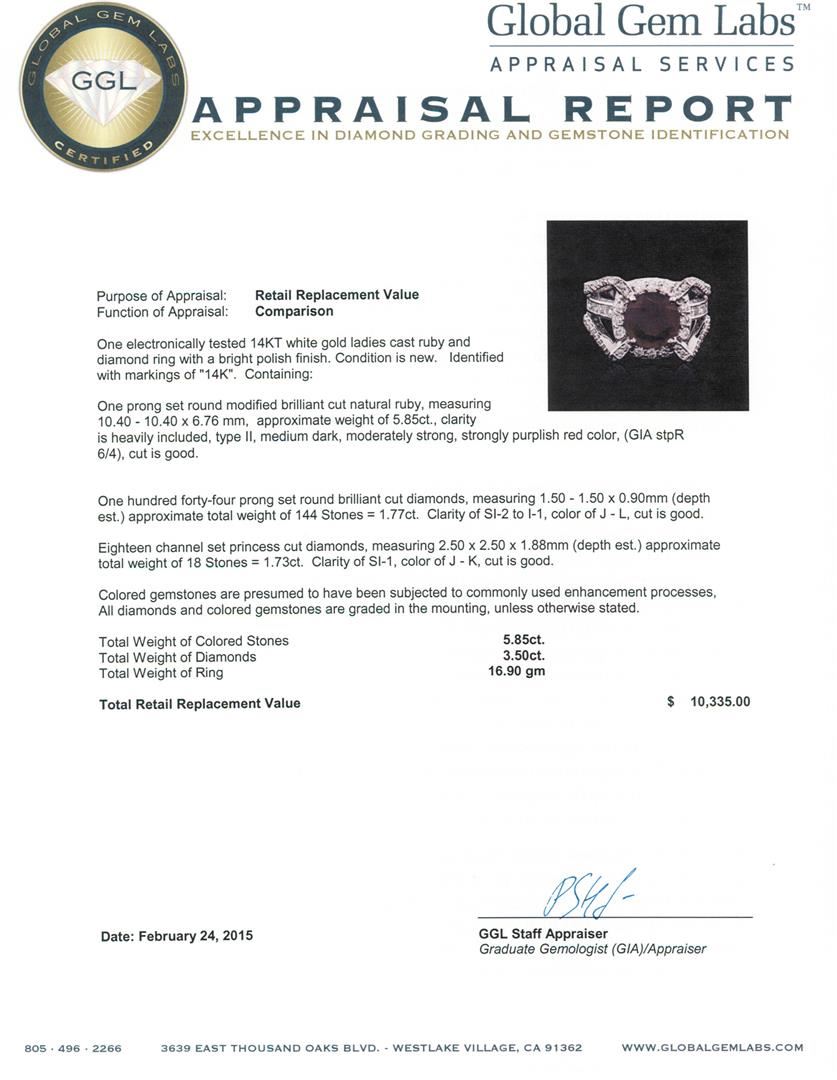 One electronically tested 14KT white gold ladies cast ruby and diamond ring with a bright polish finish. Identified with markings of "14K". Condition is new. Containing: One prong set round modified brilliant cut natural ruby, measuring 10.40 - 10.40 x 6.76 mm, approximate weight of 5.85ct., clarity is heavily included, type II, medium dark, moderately strong, strongly purplish red color, (GIA stpR 6/4), cut is good. One Hundred Forty-Four prong set round brilliant cut diamonds, measuring 1.50 - 1.50 x 0.90mm (depth est.) approximate total weight of 144 Stones = 1.77ct. Clarity: SI-2 to I-1. Color: J - L, Cut is Good. Eighteen channel set princess cut diamonds, measuring 2.50 x 2.50 x 1.88mm (depth est.) approximate total weight of 18 Stones = 1.73ct. Clarity: SI-1. Color: J - K, Cut is Good. Colored gemstones are presumed to have been subjected to commonly used enhancement processes, All diamonds and colored gemstones are graded in the mounting, unless otherwise stated. Total Weight of Colored Stones 5.85ct. Total Weight of Diamonds 3.50ct. Total Weight of Ring 16.90 grams. GGL Appraised at $10,335.00.