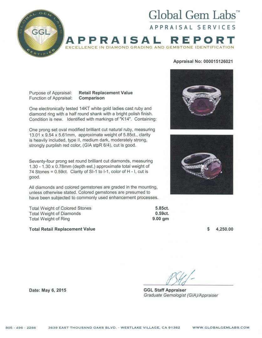 One electronically tested 14KT white gold ladies cast ruby and diamond ring with a half round shank with a bright polish finish. Identified with markings of "K14". Condition is new. Containing: One prong set oval modified brilliant cut natural ruby, measuring 13.01 x 9.54 x 5.61mm, approximate weight of 5.85ct., clarity is heavily included, type II, medium dark, moderately strong, strongly purplish red color, (GIA stpR 6/4), cut is good. Seventy-Four prong set round brilliant cut diamonds, measuring 1.30 - 1.30 x 0.78mm (depth est.) approximate total weight of 74 Stones = 0.59ct. Clarity: SI-1 to I-1. Color: H - I, Cut is Good. All diamonds and colored gemstones are graded in the mounting, unless otherwise stated. Colored gemstones are presumed to have been subjected to commonly used enhancement processes. Total Weight of Colored Stones 5.85ct. Total Weight of Diamonds 0.59ct. Total Weight of Ring 9.00 grams. GGL Appraised at $4,250.00.