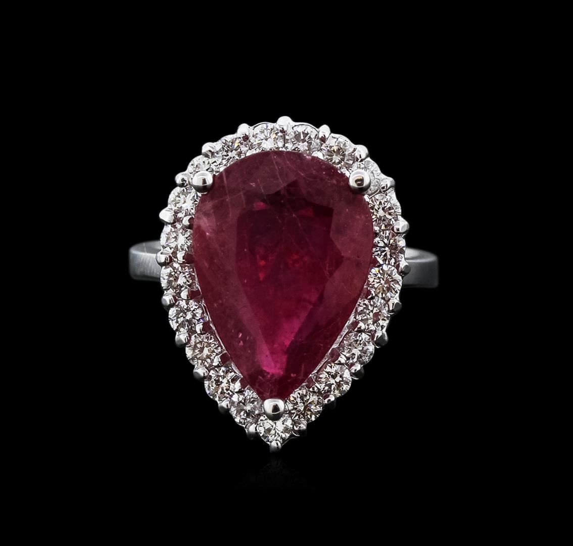 One electronically tested 14KT white gold ladies cast ruby and diamond ring with a bright polish finish. Identified with markings of "14K". Condition is new. Containing: One prong set pear modified brilliant cut natural ruby, measuring 15.00. x 10.00. x 4.90mm, approximate weight of 5.88ct., clarity is heavily included, type II, medium dark, moderately strong, strongly purplish red color, (GIA stpR 6/4), cut is good. Twenty-One prong set round brilliant cut diamonds, measuring 1.90 - 1.90 x 1.14mm (depth est.) approximate total weight of 21 Stones = 0.53ct. Clarity: SI-1 to SI-2. Color: I - J. All diamonds and colored gemstones are graded in the mounting, unless otherwise stated. Colored gemstones are presumed to have been subjected to commonly used enhancement processes. Total Weight of Colored Stones 5.88ct. Total Weight of Diamonds 0.53ct. Total Weight of Ring 6.80 grams. GGL Appraised at $4,460.00.
