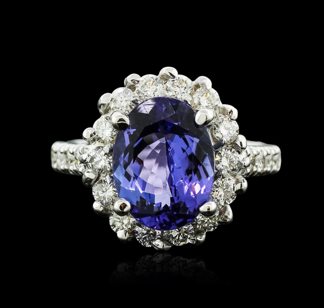 One electronically tested 14KT white gold ladies cast tanzanite and diamond ring with a bright polish finish. Identified with markings of "14K". Condition is new. Containing: One prong set oval modified brilliant cut natural tanzanite, measuring 11.70 x 9.00 x 7.98mm, approximate weight of 5.91ct., clarity is eye clean, type I, medium, moderately strong, bluish violet color, (GIA bV 5/4), cut is good. Twenty-Four prong set round brilliant cut diamonds, measuring 2.00 - 2.00 x 1.20mm (depth est.) approximate total weight of 24 Stones = 0.70ct.. Clarity: SI-1 to SI-2. Color: I - J, Cut is Good. Colored gemstones are presumed to have been subjected to commonly used enhancement processes. All diamonds and colored gemstones are graded in the mounting, unless otherwise stated.. Total Weight of Colored Stones 5.91ct.. Total Weight of Diamonds 0.70ct.. Total Weight of Ring 7.40 grams. GGL Appraised at $6,510.00.
