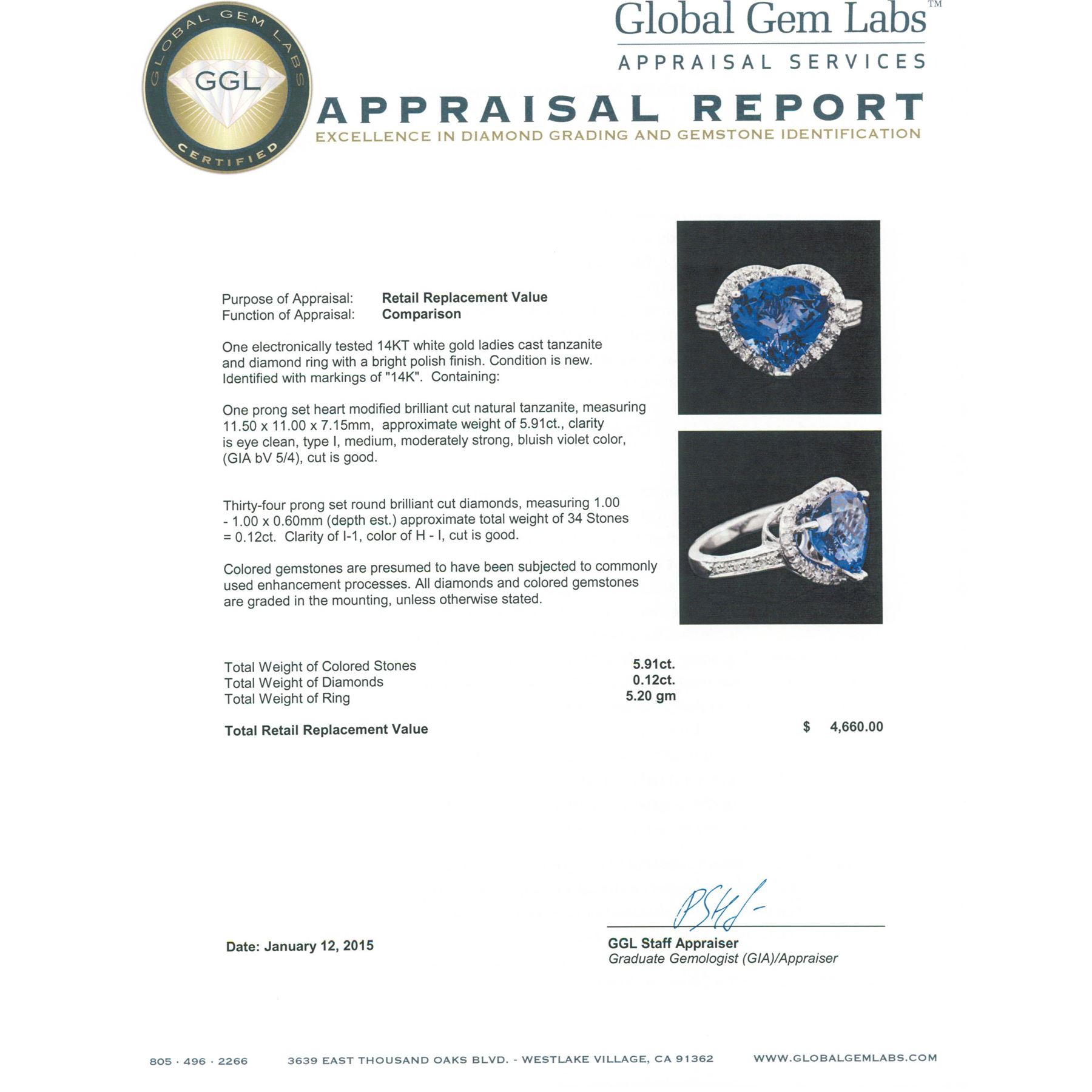 One electronically tested 14KT white gold ladies cast tanzanite and diamond ring with a bright polish finish. Identified with markings of "14K". Condition is new. Containing: One prong set heart modified brilliant cut natural tanzanite, measuring 11.50 x 11.00 x 7.15mm, approximate weight of 5.91ct., clarity is eye clean, type I, medium, moderately strong, bluish violet color, (GIA bV 5/4), cut is good. Thirty-Four prong set round brilliant cut diamonds, measuring 1.00 - 1.00 x 0.60mm (depth est.) approximate total weight of 34 Stones = 0.12ct. Clarity: I-1. Color: H - I, Cut is Good. Colored gemstones are presumed to have been subjected to commonly used enhancement processes. All diamonds and colored gemstones are graded in the mounting, unless otherwise stated. Total Weight of Colored Stones 5.91ct. Total Weight of Diamonds 0.12ct. Total Weight of Ring 5.20 grams. GGL Appraised at $4,660.00.
