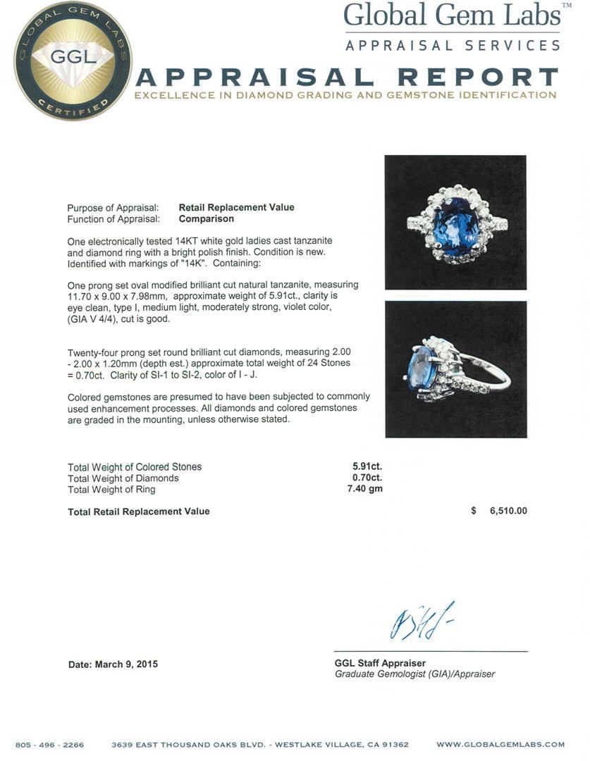 One electronically tested 14KT white gold ladies cast tanzanite and diamond ring with a bright polish finish. Identified with markings of "14K". Condition is new. Containing: One prong set oval modified brilliant cut natural tanzanite, measuring 11.70 x 9.00 x 7.98mm, approximate weight of 5.91ct., clarity is eye clean, type I, medium, moderately strong, bluish violet color, (GIA bV 5/4), cut is good. Twenty-Four prong set round brilliant cut diamonds, measuring 2.00 - 2.00 x 1.20mm (depth est.) approximate total weight of 24 Stones = 0.70ct.. Clarity: SI-1 to SI-2. Color: I - J, Cut is Good. Colored gemstones are presumed to have been subjected to commonly used enhancement processes. All diamonds and colored gemstones are graded in the mounting, unless otherwise stated.. Total Weight of Colored Stones 5.91ct.. Total Weight of Diamonds 0.70ct.. Total Weight of Ring 7.40 grams. GGL Appraised at $6,510.00.