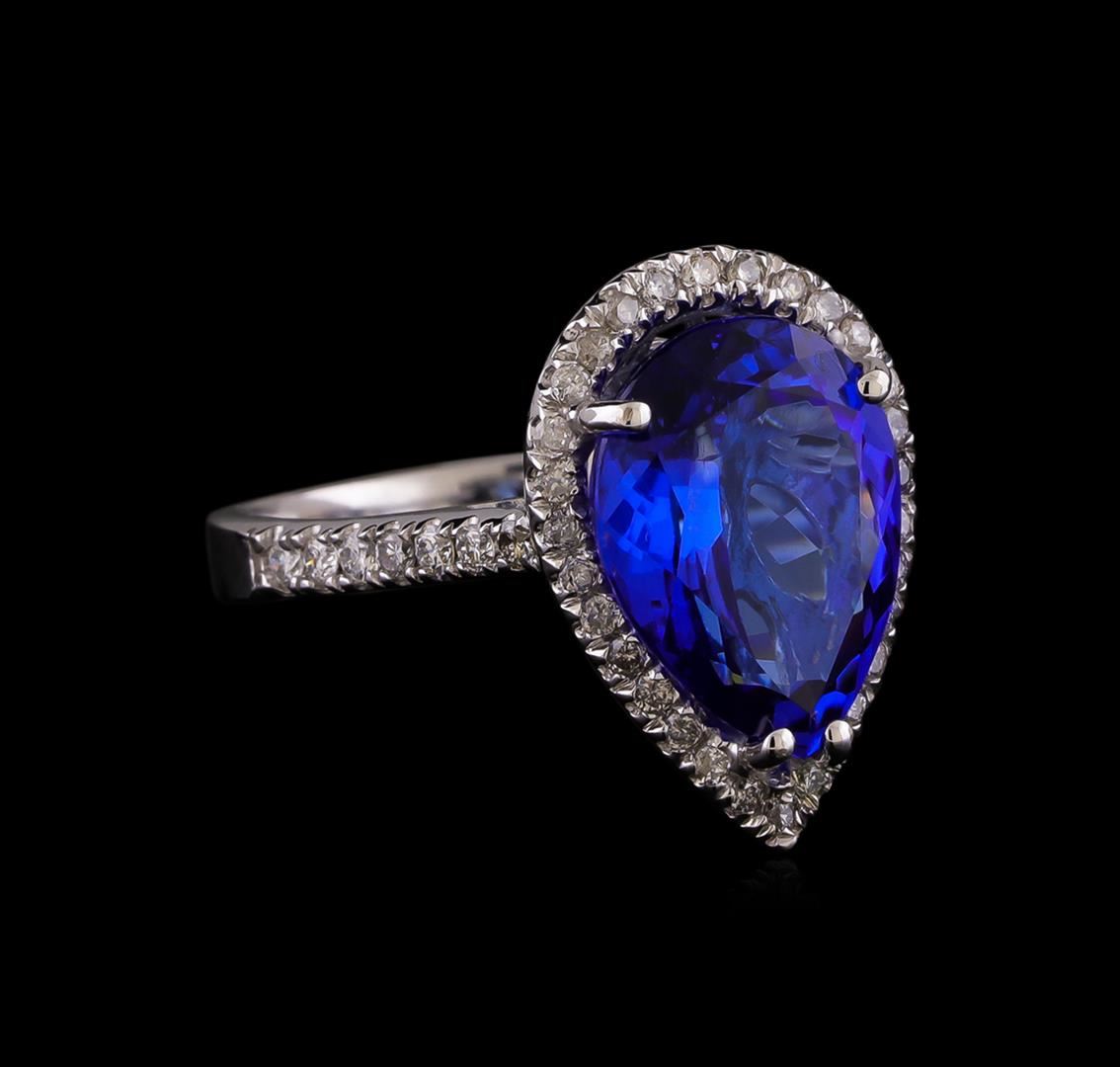 One electronically tested 14KT white gold ladies combination cast & assembled tanzanite and diamond ring with a bright polish finish. Identified with markings of "K14". Condition is new. Containing: One prong set pear modified brilliant cut natural tanzanite, measuring 13.38 x 10.09 x 6.56mm, approximate weight of 5.93ct., clarity is eye clean, type I, medium, moderately strong, violet color, (GIA V 5/4), cut is good. Forty-Three prong set round brilliant cut diamonds, measuring 1.50 - 1.30 x 0.84mm (depth est.) approximate total weight of 43 Stones = 0.43ct. Clarity: SI-2 to I-1. Color: I - J, Cut is Good. Colored gemstones are presumed to have been subjected to commonly used enhancement processes. All diamonds and colored gemstones are graded in the mounting, unless otherwise stated. Total Weight of Colored Stones 5.93ct. Total Weight of Diamonds 0.43ct. Total Weight of Ring 5.60 grams. GGL Appraised at $6,345.00.