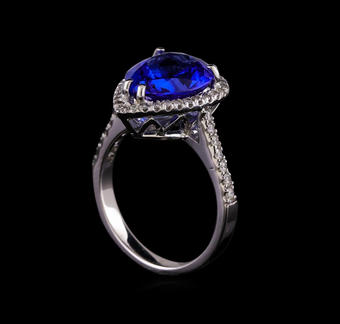 One electronically tested 14KT white gold ladies combination cast & assembled tanzanite and diamond ring with a bright polish finish. Identified with markings of "K14". Condition is new. Containing: One prong set pear modified brilliant cut natural tanzanite, measuring 13.38 x 10.09 x 6.56mm, approximate weight of 5.93ct., clarity is eye clean, type I, medium, moderately strong, violet color, (GIA V 5/4), cut is good. Forty-Three prong set round brilliant cut diamonds, measuring 1.50 - 1.30 x 0.84mm (depth est.) approximate total weight of 43 Stones = 0.43ct. Clarity: SI-2 to I-1. Color: I - J, Cut is Good. Colored gemstones are presumed to have been subjected to commonly used enhancement processes. All diamonds and colored gemstones are graded in the mounting, unless otherwise stated. Total Weight of Colored Stones 5.93ct. Total Weight of Diamonds 0.43ct. Total Weight of Ring 5.60 grams. GGL Appraised at $6,345.00.