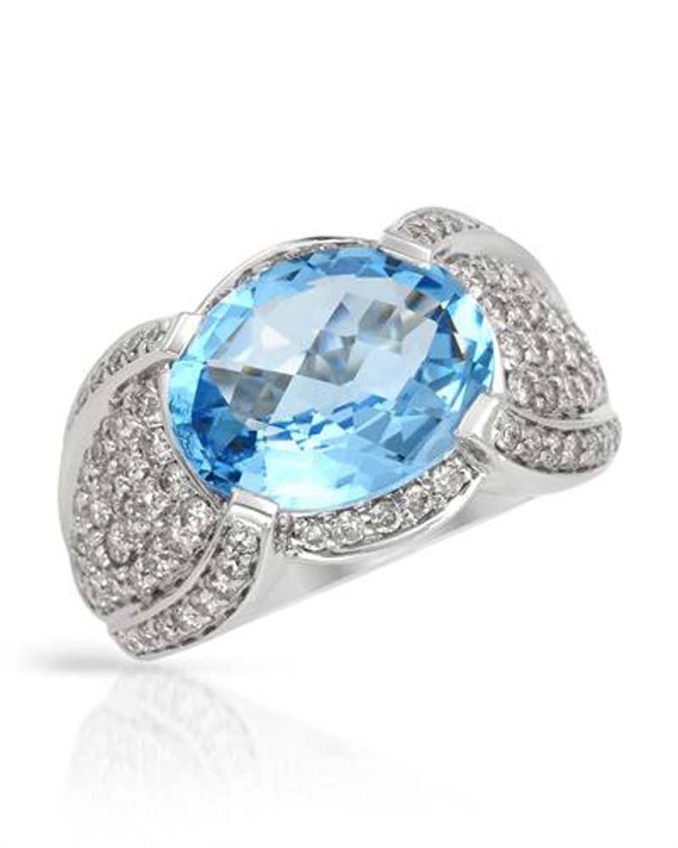 One 14KT White Gold 5.94ct Blue Topaz and Diamond Ring. (1) Blue Topaz stone with a total weight of 5.94cts. (92) Diamonds with a total weight of 1.17cts. The total weight of this ring is 9.09 grams.