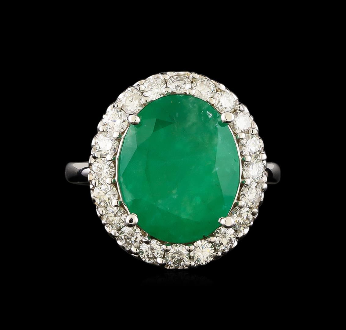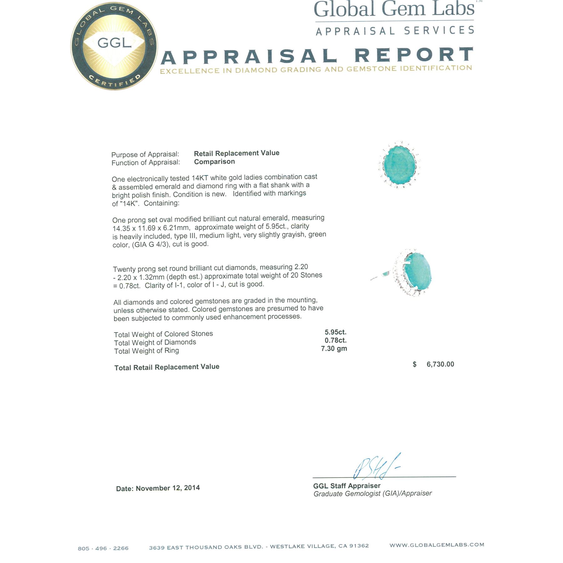 One electronically tested 14KT white gold ladies combination cast & assembled emerald and diamond ring with a flat shank with a bright polish finish. Identified with markings of "14K". Condition is new. Containing: One prong set oval modified brilliant cut natural emerald, measuring 14.35 x 11.69 x 6.21mm, approximate weight of 5.95ct., clarity is heavily included, type III, medium light, very slightly grayish, green color, (GIA G 4/3), cut is good. Twenty prong set round brilliant cut diamonds, measuring 2.20 - 2.20 x 1.32mm (depth est.) approximate total weight of 20 Stones = 0.78ct. Clarity: I-1. Color: I - J, Cut is Good. All diamonds and colored gemstones are graded in the mounting, unless otherwise stated. Colored gemstones are presumed to have been subjected to commonly used enhancement processes. Total Weight of Colored Stones 5.95ct. Total Weight of Diamonds 0.78ct. Total Weight of Ring 7.30 grams. GGL Appraised at $6,730.00.