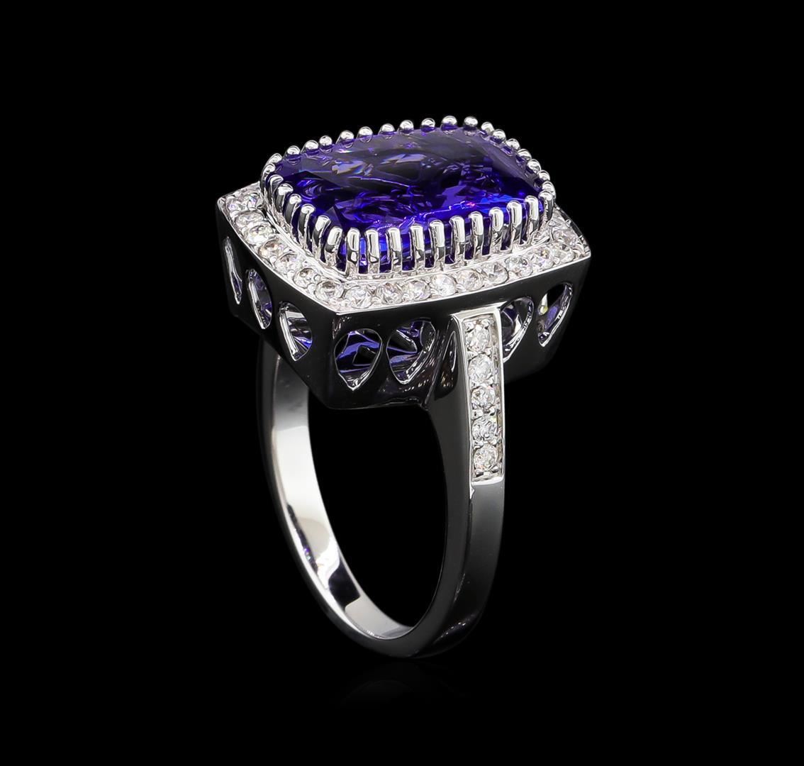 One electronically tested 14KT white gold Ladies combination cast & assembled ring with a bright polish finish. Condition is new. Identified with markings of "14K". Containing: One prong set rectangular cushion modified brilliant cut natural tanzanite, measuring 14.00 x 10.00 x 5.40mm, approximate weight of 5.95ct., clarity is eye clean, type I, medium dark, moderately strong, bluish violet color, (GIA bV 6/4), cut is very good. Colored gemstones are presumed to have been subjected to commonly used color/clarity enhancement processes. Forty-Two prong set round brilliant cut diamonds, measuring 1.50 - 1.50 x 0.90mm (depth est.) approximate. Total Weight of 42 Stones = 0.52ct. Clarity: SI-2 to I-1. Color: G - H, Cut is Good. Total Weight of Colored Stones 5.95ct. Total Weight of Diamonds 0.52ct. Total Weight of Ring 8.20 grams. GGL Appraised.