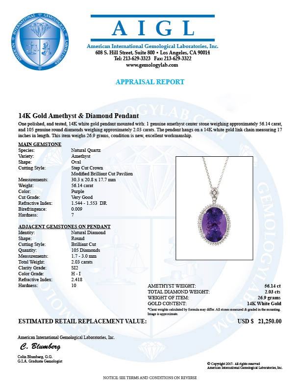One 14KT White Gold 56.14ct Amethyst and Diamond Pendant with Chain. (1) Amethyst stone with a total weight of 56.14cts. (105) Diamonds with a total weight of 2.03cts with a color of H-I and clarity of SI-2. Total weight of this pendant is 26.9 grams.