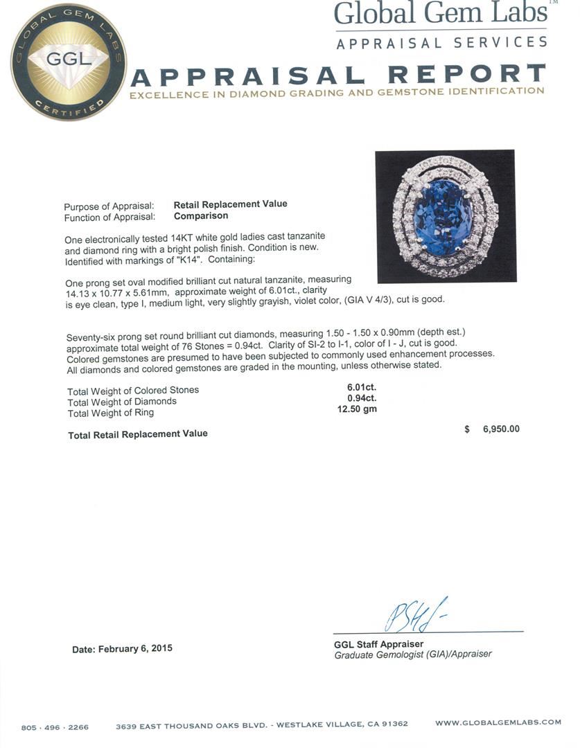 One electronically tested 14KT white gold ladies cast tanzanite and diamond ring with a bright polish finish. Identified with markings of "K14". Condition is new. Containing: One prong set oval modified brilliant cut natural tanzanite, measuring 14.13 x 10.77 x 5.61mm, approximate weight of 6.01ct., clarity is eye clean, type I, medium light, very slightly grayish, violet color, (GIA V 4/3), cut is good. Seventy-Six prong set round brilliant cut diamonds, measuring 1.50 - 1.50 x 0.90mm (depth est.) approximate. total weight of 76 Stones = 0.94ct. Clarity: SI-2 to I-1. Color: I - J, Cut is Good. Colored gemstones are presumed to have been subjected to commonly used enhancement processes. All diamonds and colored gemstones are graded in the mounting, unless otherwise stated. Total Weight of Colored Stones 6.01ct. Total Weight of Diamonds 0.94ct. Total Weight of Ring 12.50 grams. GGL Appraised at $6,950.00.