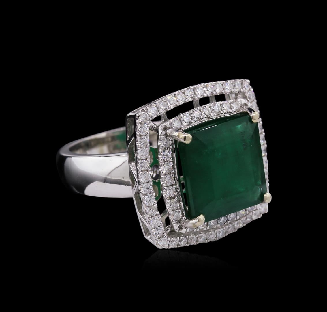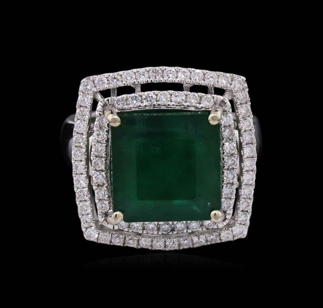 One electronically tested 14KT white gold Ladies combination cast & assembled ring with a bright polish finish. Condition is new. Containing: One prong set emerald standard step cut natural emerald, measuring 11.10 x 11.10 x 6.66mm, approximate weight of 6.03ct., clarity is heavily included, type III, medium, moderately strong, green color, (GIA G 5/4), cut is good. Colored gemstones are presumed to have been subjected to commonly used color/clarity enhancement processes. Seventy-Two prong set round brilliant cut diamonds, measuring 1.30 - 1.30 x 0.78mm (depth est.) approximate. Total Weight of 72 Stones = 0.58ct. Clarity: I-1 to I-2. Color: I - J, Cut is Good. Total Weight of Colored Stones 6.03ct. Total Weight of Diamonds 0.58ct. Total Weight of Ring 9.40 grams. GGL Appraised at $10,030.00.