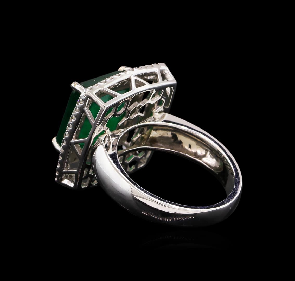 One electronically tested 14KT white gold Ladies combination cast & assembled ring with a bright polish finish. Condition is new. Containing: One prong set emerald standard step cut natural emerald, measuring 11.10 x 11.10 x 6.66mm, approximate weight of 6.03ct., clarity is heavily included, type III, medium, moderately strong, green color, (GIA G 5/4), cut is good. Colored gemstones are presumed to have been subjected to commonly used color/clarity enhancement processes. Seventy-Two prong set round brilliant cut diamonds, measuring 1.30 - 1.30 x 0.78mm (depth est.) approximate. Total Weight of 72 Stones = 0.58ct. Clarity: I-1 to I-2. Color: I - J, Cut is Good. Total Weight of Colored Stones 6.03ct. Total Weight of Diamonds 0.58ct. Total Weight of Ring 9.40 grams. GGL Appraised at $10,030.00.