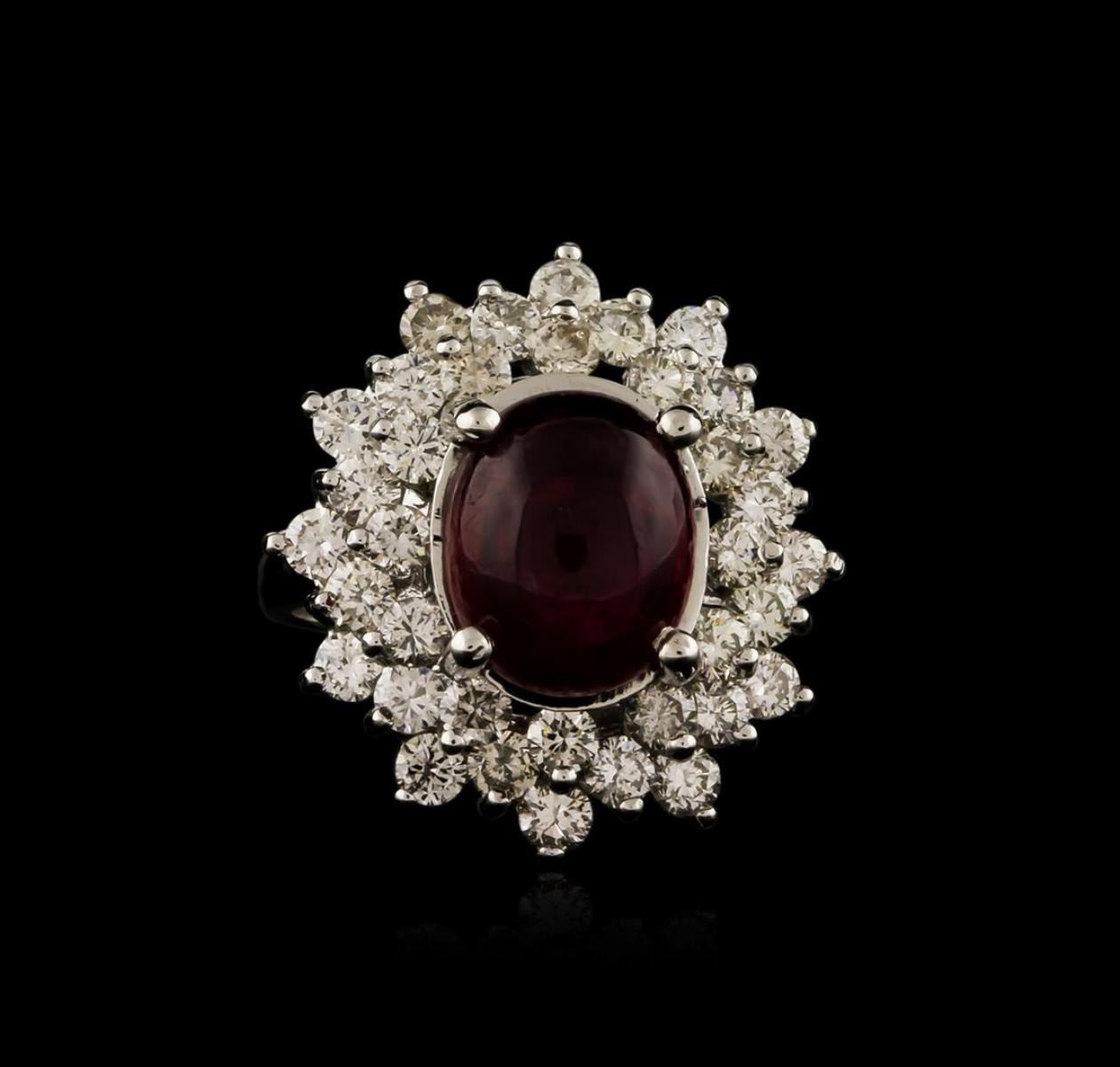 One electronically tested 14KT white gold ladies cast ruby and diamond ring with a bright polish finish. Identified with markings of "14K". Condition is new. Containing: One prong set oval cabochon cut natural ruby, measuring 11.40 x 9.40 x 5.23mm, approximate weight of 6.05ct., clarity is heavily included, type II, medium dark, moderately strong, strongly purplish red color, (GIA stpR 6/4), cut is good. Thirty-Six prong set round brilliant cut diamonds, measuring 2.60 - 2.50 x 1.53mm (depth est.) approximate total weight of 36 Stones = 2.18ct. Clarity: SI-1 to SI-2. Color: J - K, Cut is Good. Colored gemstones are presumed to have been subjected to commonly used enhancement processes, All diamonds and colored gemstones are graded in the mounting, unless otherwise stated. Total Weight of Colored Stones 6.05ct. Total Weight of Diamonds 2.18ct. Total Weight of Ring 8.80 grams. GGL Appraised.