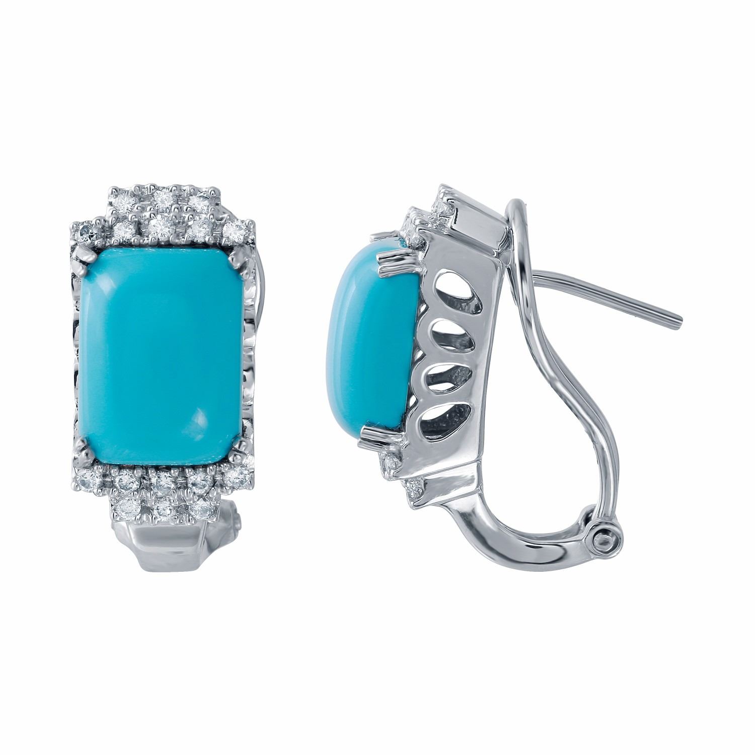 One 14KT White Gold 6.06ctw Turquoise and Diamond Earrings. (2) Turquoise stones with a total weight of 6.06cts. (32) Diamonds with a total weight of 0.35cts with a color of I and a clarity of I-1 to I-2. Total weight of these earrings are 6.71 grams.