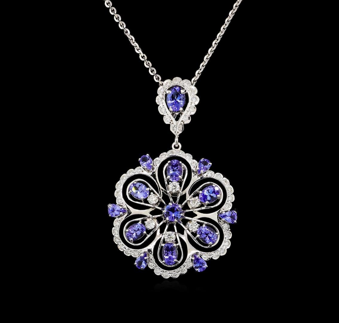 One electronically tested 14KT white gold ladies combination cast & assembled tanzanite and diamond pendant & chain 18.0" long, cable link with a lobster claw clasp with a bright polish finish. Identified with markings of "14K". Condition is new. Containing: Six prong set pear modified brilliant cut natural tanzanites, measuring 6.00 x 3.00 x 1.95mm, approximate total weight of 1.44ct., clarity is eye clean, type I, medium light, very slightly grayish, violet color, (GIA V 4/3), cut is good. One prong set oval modified brilliant cut natural tanzanite, measuring 8.00 x 6.00 x 3.90mm, approximate weight of 1.32ct., clarity is eye clean, type I, medium light, very slightly grayish, violet color, (GIA V 4/3), cut is good. Six prong set oval modified brilliant cut natural tanzanites, measuring 6.00 x 4.00 x 2.60mm, approximate total weight of 2.64ct., clarity is eye clean, type I, medium light, very slightly grayish, violet color, (GIA V 4/3), cut is good. One prong set round modified brilliant cut natural tanzanite, measuring 5.50 - 5.50 x 3.58 mm, approximate total weight of 0.73ct., clarity is eye clean, type I, medium light, very slightly grayish, violet color, (GIA V 4/3), cut is good. Fifty-Five prong set round brilliant cut diamonds, measuring 3.00 - 1.50 x 1.35mm (depth est.) approximate total weight of 55 Stones = 1.00ct. Clarity: SI-1 to I-1. Color: H - I. Colored gemstones are presumed to have been subjected to commonly used enhancement processes. All diamonds and colored gemstones are graded in the mounting, unless otherwise stated. Total Weight of Colored Stones 6.13ct. Total Weight of Diamonds 1.00ct. Total Weight of Pendant & Chain 21.30 grams. GGL Appraised at $7,630.00.