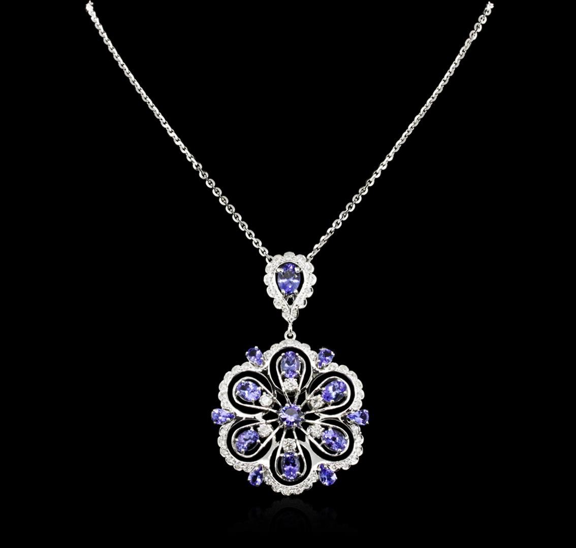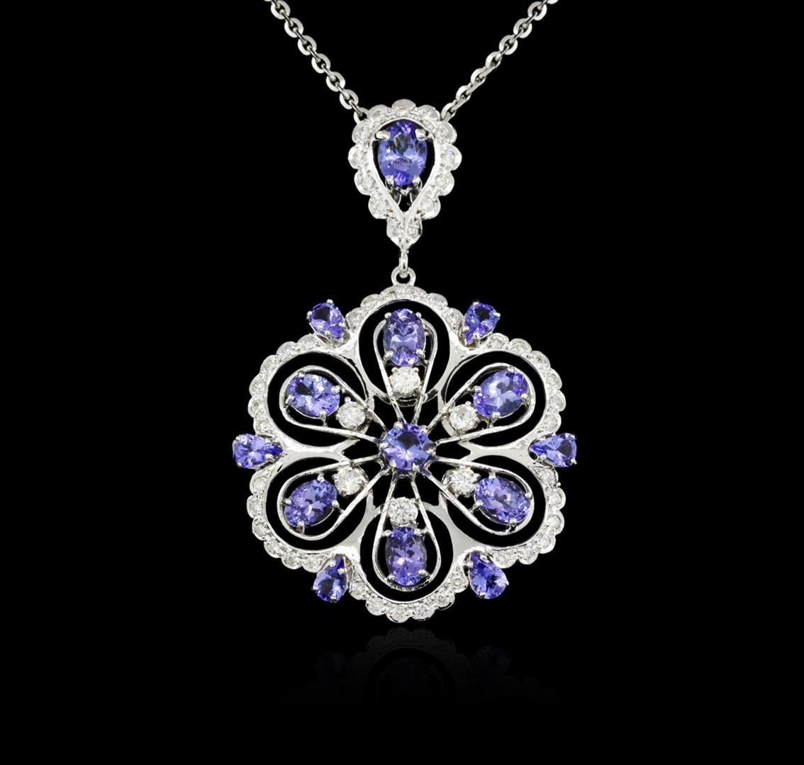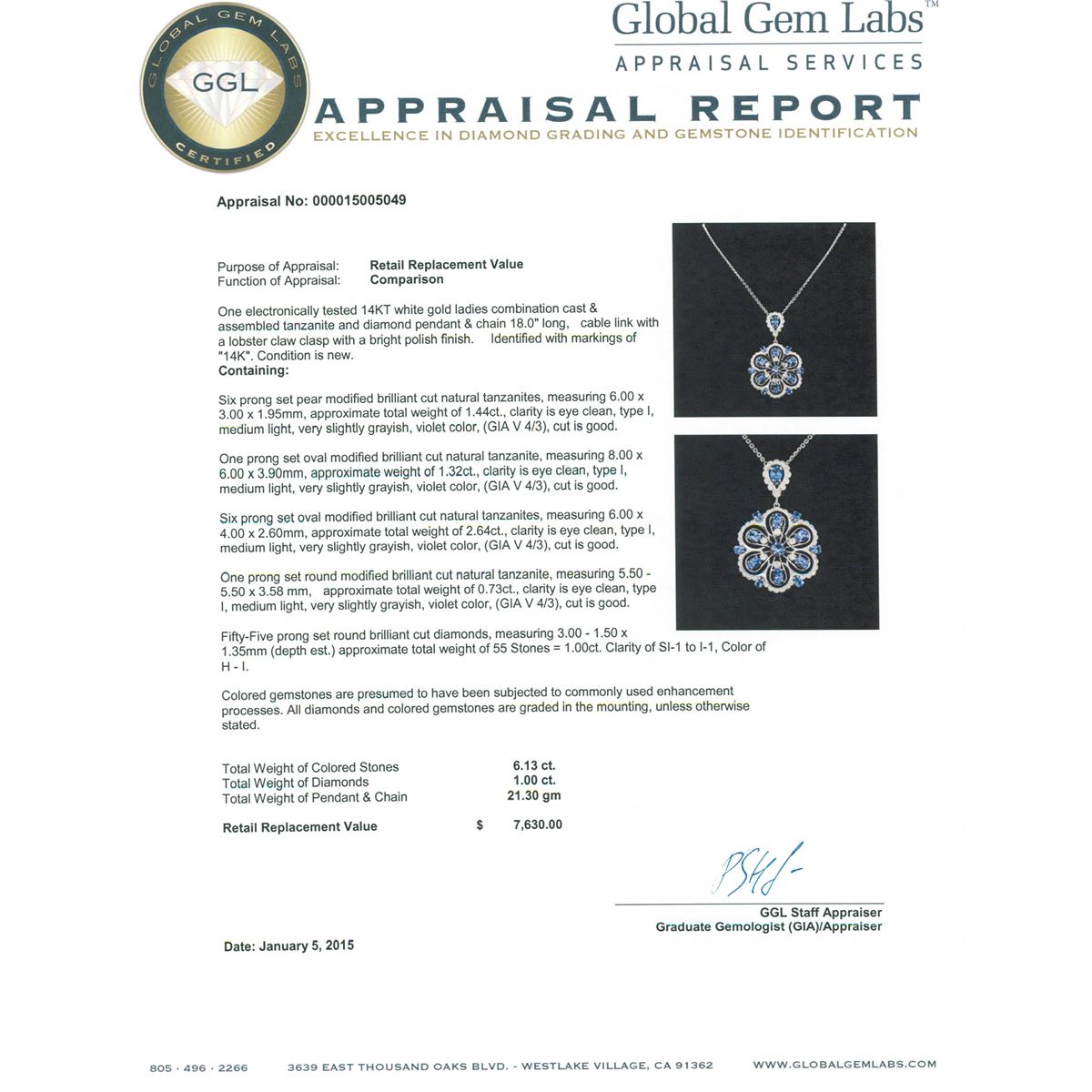 One electronically tested 14KT white gold ladies combination cast & assembled tanzanite and diamond pendant & chain 18.0" long, cable link with a lobster claw clasp with a bright polish finish. Identified with markings of "14K". Condition is new. Containing: Six prong set pear modified brilliant cut natural tanzanites, measuring 6.00 x 3.00 x 1.95mm, approximate total weight of 1.44ct., clarity is eye clean, type I, medium light, very slightly grayish, violet color, (GIA V 4/3), cut is good. One prong set oval modified brilliant cut natural tanzanite, measuring 8.00 x 6.00 x 3.90mm, approximate weight of 1.32ct., clarity is eye clean, type I, medium light, very slightly grayish, violet color, (GIA V 4/3), cut is good. Six prong set oval modified brilliant cut natural tanzanites, measuring 6.00 x 4.00 x 2.60mm, approximate total weight of 2.64ct., clarity is eye clean, type I, medium light, very slightly grayish, violet color, (GIA V 4/3), cut is good. One prong set round modified brilliant cut natural tanzanite, measuring 5.50 - 5.50 x 3.58 mm, approximate total weight of 0.73ct., clarity is eye clean, type I, medium light, very slightly grayish, violet color, (GIA V 4/3), cut is good. Fifty-Five prong set round brilliant cut diamonds, measuring 3.00 - 1.50 x 1.35mm (depth est.) approximate total weight of 55 Stones = 1.00ct. Clarity: SI-1 to I-1. Color: H - I. Colored gemstones are presumed to have been subjected to commonly used enhancement processes. All diamonds and colored gemstones are graded in the mounting, unless otherwise stated. Total Weight of Colored Stones 6.13ct. Total Weight of Diamonds 1.00ct. Total Weight of Pendant & Chain 21.30 grams. GGL Appraised at $7,630.00.