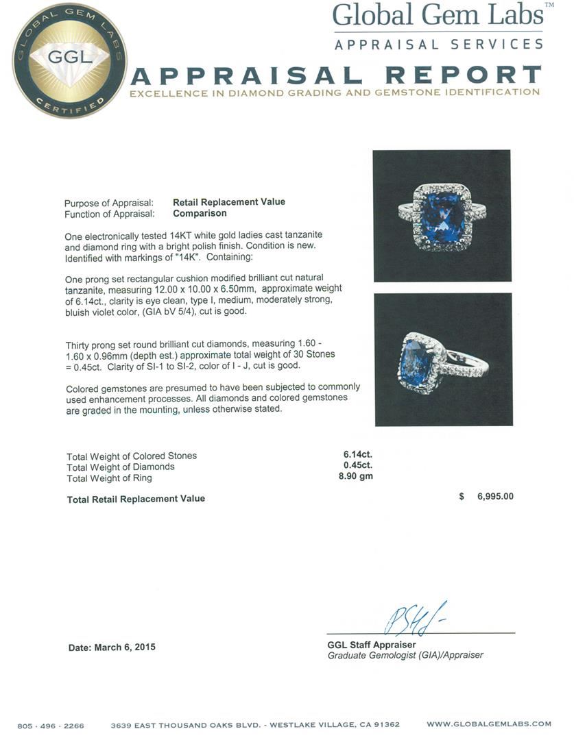 One electronically tested 14KT white gold ladies cast tanzanite and diamond ring with a bright polish finish. Identified with markings of "14K". Condition is new. Containing: One prong set rectangular cushion modified brilliant cut natural tanzanite, measuring 12.00 x 10.00 x 6.50mm, approximate weight of 6.14ct., clarity is eye clean, type I, medium, moderately strong, bluish violet color, (GIA bV 5/4), cut is good. Thirty prong set round brilliant cut diamonds, measuring 1.60 - 1.60 x 0.96mm (depth est.) approximate total weight of 30 Stones = 0.45ct. . Clarity: SI-1 to SI-2. Color: I - J, Cut is Good. Colored gemstones are presumed to have been subjected to commonly used enhancement processes. All diamonds and colored gemstones are graded in the mounting, unless otherwise stated.. Total Weight of Colored Stones 6.14ct.. Total Weight of Diamonds 0.45ct.. Total Weight of Ring 8.90 grams. GGL Appraised at $6,995.00.