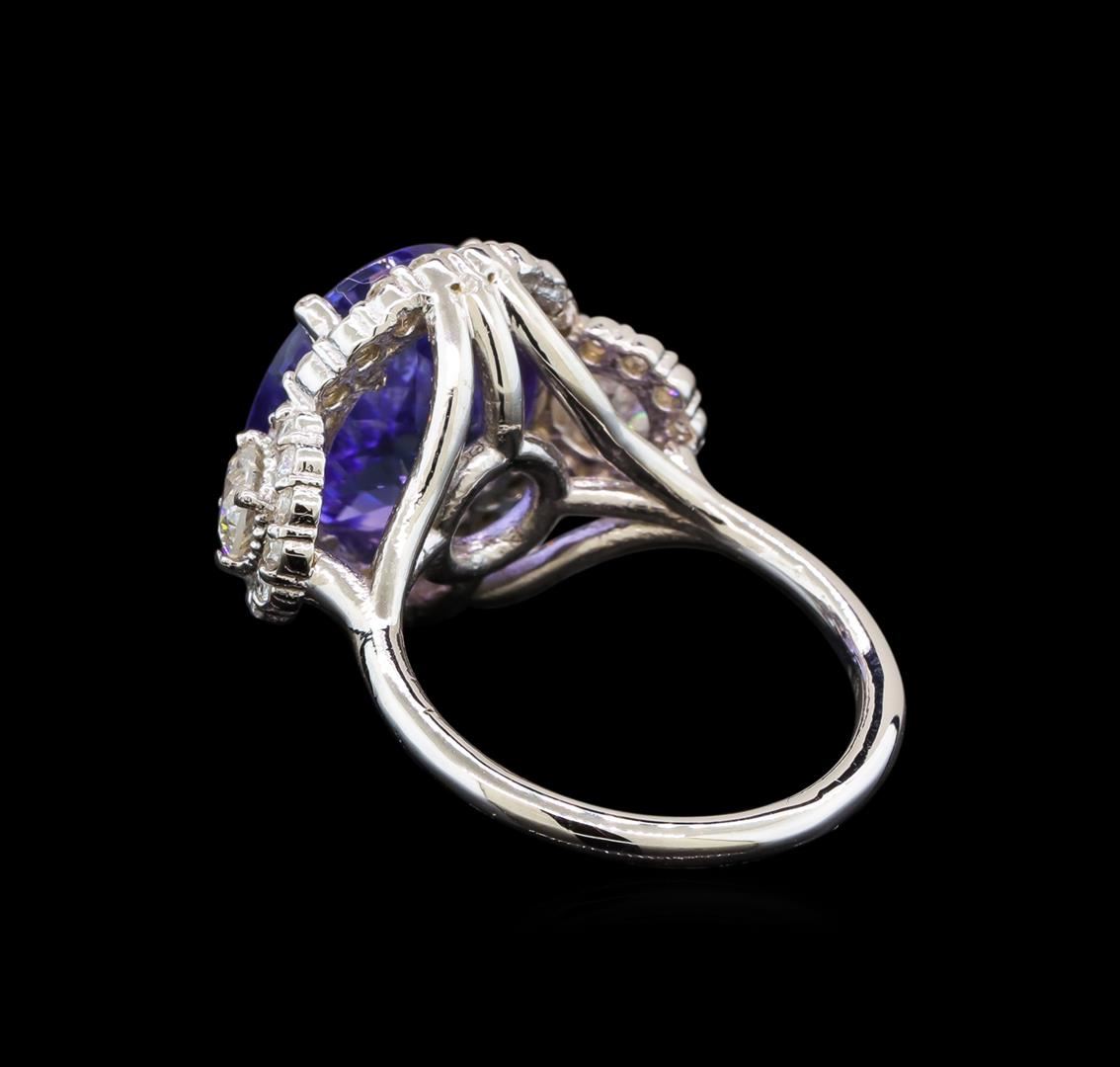 One electronically tested 14KT white gold ladies cast tanzanite and diamond ring with a bright polish finish. Identified with markings of "K14". Condition is new. Containing: One prong set oval modified brilliant cut natural tanzanite, measuring 12.40 x 10.50 x 6.70mm, approximate weight of 6.14ct., clarity is eye clean, type I, medium light, very slightly grayish, violet color, (GIA V 4/3), cut is good. Two prong set round brilliant cut diamonds, measuring 4.20 - 4.20 x 2.52mm (depth est.) approximate total weight of 2 Stones = 0.54ct. Clarity: SI-2. Color: I - J, Cut is Good. Forty prong set round brilliant cut diamonds, measuring 1.40 - 1.40 x 0.84mm (depth est.) approximate total weight of 40 Stones = 0.40ct. Clarity: SI-2 to I-1. Color: I - J, Cut is Good. Colored gemstones are presumed to have been subjected to commonly used enhancement processes. All diamonds and colored gemstones are graded in the mounting, unless otherwise stated. Total Weight of Colored Stones 6.14ct. Total Weight of Diamonds 0.94ct. Total Weight of Ring 7.00 grams. GGL Appraised at $6,455.00.
