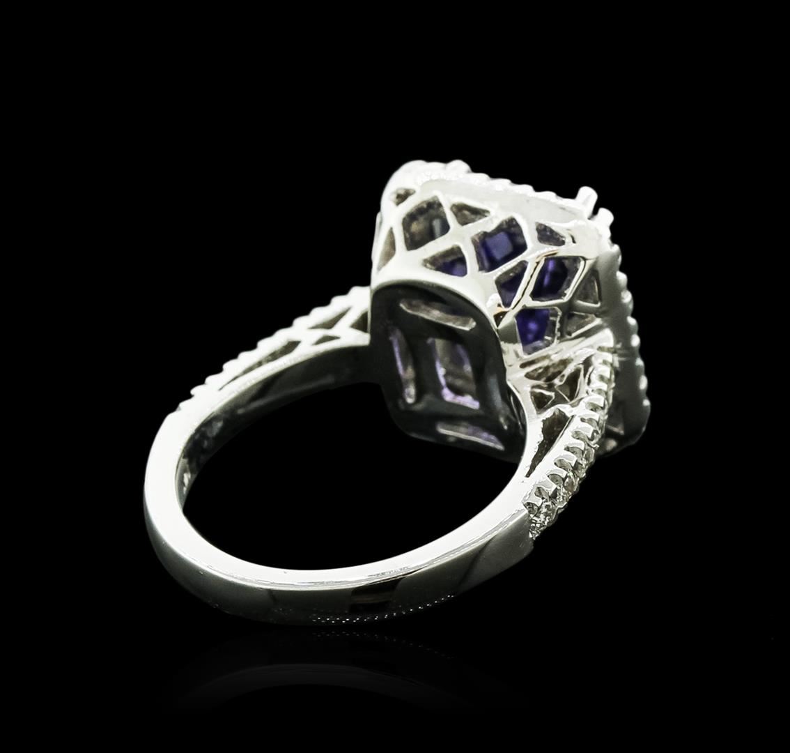 One electronically tested 14KT white gold ladies cast tanzanite and diamond ring with a bright polish finish. Identified with markings of "14K". Condition is new. Containing: One prong set rectangular cushion modified brilliant cut natural tanzanite, measuring 12.00 x 10.00 x 6.50mm, approximate weight of 6.14ct., clarity is eye clean, type I, medium, moderately strong, bluish violet color, (GIA bV 5/4), cut is good. Thirty prong set round brilliant cut diamonds, measuring 1.60 - 1.60 x 0.96mm (depth est.) approximate total weight of 30 Stones = 0.45ct. . Clarity: SI-1 to SI-2. Color: I - J, Cut is Good. Colored gemstones are presumed to have been subjected to commonly used enhancement processes. All diamonds and colored gemstones are graded in the mounting, unless otherwise stated.. Total Weight of Colored Stones 6.14ct.. Total Weight of Diamonds 0.45ct.. Total Weight of Ring 8.90 grams. GGL Appraised.
