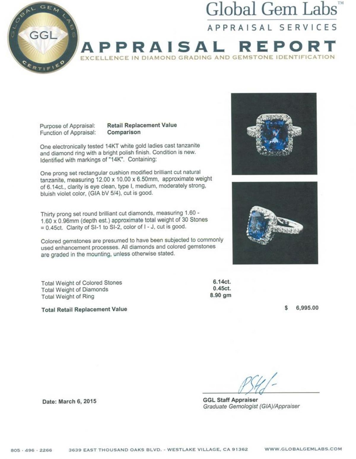 One electronically tested 14KT white gold ladies cast tanzanite and diamond ring with a bright polish finish. Identified with markings of "14K". Condition is new. Containing: One prong set rectangular cushion modified brilliant cut natural tanzanite, measuring 12.00 x 10.00 x 6.50mm, approximate weight of 6.14ct., clarity is eye clean, type I, medium, moderately strong, bluish violet color, (GIA bV 5/4), cut is good. Thirty prong set round brilliant cut diamonds, measuring 1.60 - 1.60 x 0.96mm (depth est.) approximate total weight of 30 Stones = 0.45ct. . Clarity: SI-1 to SI-2. Color: I - J, Cut is Good. Colored gemstones are presumed to have been subjected to commonly used enhancement processes. All diamonds and colored gemstones are graded in the mounting, unless otherwise stated.. Total Weight of Colored Stones 6.14ct.. Total Weight of Diamonds 0.45ct.. Total Weight of Ring 8.90 grams. GGL Appraised.