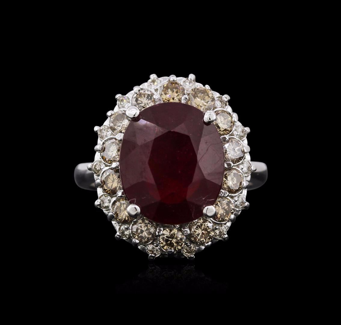 One electronically tested 14KT white gold ladies cast ruby and diamond ring with a bright polish finish. Identified with markings of "K14". Condition is new. Containing: One prong set oval modified brilliant cut natural ruby, measuring 12.63 x 10.80 x 5.38mm, approximate weight of 6.16ct., clarity is heavily included, type II, medium dark, very slightly brownish, strongly purplish red color, (GIA stpR 6/3), cut is good. Fourteen prong set round brilliant cut diamonds, measuring 2.90 - 2.90 x 1.74mm (depth est.) approximate total weight of 14 Stones = 1.25ct. Clarity: SI-1, Cut is Good. Fourteen prong set round brilliant cut diamonds, measuring 1.50 - 1.50 x 0.90mm (depth est.) approximate total weight of 14 Stones = 0.17ct. Clarity: SI-2 to I-2. Color: J - L, Cut is Good. Diamonds and colored gemstones are graded in the mounting, unless otherwise stated. Colored gemstones are presumed to have been subjected to commonly used enhancement processes. Total Weight of Colored Stones 6.16ct. Total Weight of Diamonds 1.42ct. Total Weight of Ring 8.00 grams. GGL Appraised at $3,575.00.