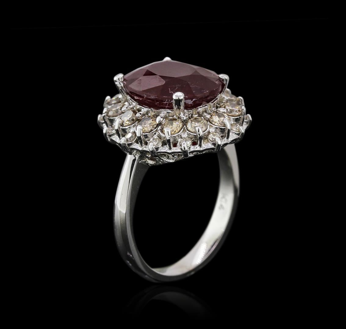 One electronically tested 14KT white gold ladies cast ruby and diamond ring with a bright polish finish. Identified with markings of "K14". Condition is new. Containing: One prong set oval modified brilliant cut natural ruby, measuring 12.63 x 10.80 x 5.38mm, approximate weight of 6.16ct., clarity is heavily included, type II, medium dark, very slightly brownish, strongly purplish red color, (GIA stpR 6/3), cut is good. Fourteen prong set round brilliant cut diamonds, measuring 2.90 - 2.90 x 1.74mm (depth est.) approximate total weight of 14 Stones = 1.25ct. Clarity: SI-1, Cut is Good. Fourteen prong set round brilliant cut diamonds, measuring 1.50 - 1.50 x 0.90mm (depth est.) approximate total weight of 14 Stones = 0.17ct. Clarity: SI-2 to I-2. Color: J - L, Cut is Good. Diamonds and colored gemstones are graded in the mounting, unless otherwise stated. Colored gemstones are presumed to have been subjected to commonly used enhancement processes. Total Weight of Colored Stones 6.16ct. Total Weight of Diamonds 1.42ct. Total Weight of Ring 8.00 grams. GGL Appraised.