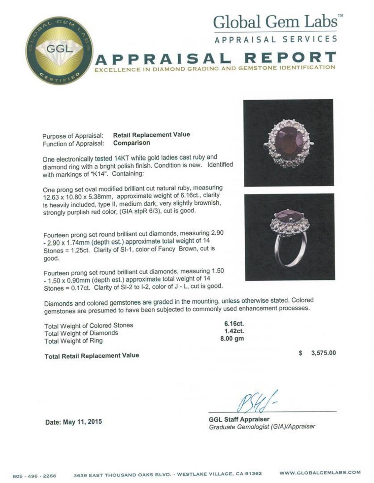 One electronically tested 14KT white gold ladies cast ruby and diamond ring with a bright polish finish. Identified with markings of "K14". Condition is new. Containing: One prong set oval modified brilliant cut natural ruby, measuring 12.63 x 10.80 x 5.38mm, approximate weight of 6.16ct., clarity is heavily included, type II, medium dark, very slightly brownish, strongly purplish red color, (GIA stpR 6/3), cut is good. Fourteen prong set round brilliant cut diamonds, measuring 2.90 - 2.90 x 1.74mm (depth est.) approximate total weight of 14 Stones = 1.25ct. Clarity: SI-1, Cut is Good. Fourteen prong set round brilliant cut diamonds, measuring 1.50 - 1.50 x 0.90mm (depth est.) approximate total weight of 14 Stones = 0.17ct. Clarity: SI-2 to I-2. Color: J - L, Cut is Good. Diamonds and colored gemstones are graded in the mounting, unless otherwise stated. Colored gemstones are presumed to have been subjected to commonly used enhancement processes. Total Weight of Colored Stones 6.16ct. Total Weight of Diamonds 1.42ct. Total Weight of Ring 8.00 grams. GGL Appraised.