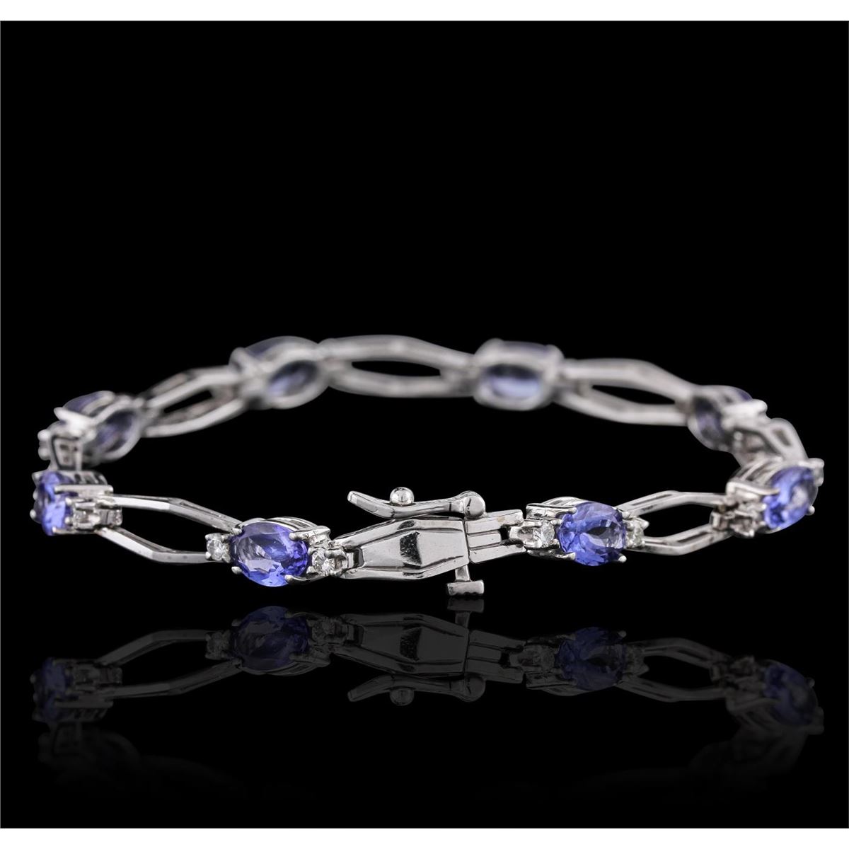 One electronically tested 14KT white gold ladies cast & assembled tanzanite and diamond bracelet with a bright polish finish. Seven inch length bracelet features a semi-flexible tanzanite and diamond ribbon, terminating in a concealed clasp with safety. Identified with markings of "14K". Condition is good. Containing: Eight prong set oval brilliant cut natural tanzanites, measuring 7.00 x 5.00 x 3.05mm, 6%. bulge factor, approximate total weight of 6.24ct., clarity is eye clean, type I, medium dark, very slightly grayish, violetish blue color, (GIA vB 6/3), cut is good. Transmitting light with no distortion, transparent. Measurements & the color grade are an average for the group. Graded in the setting. Tanzanite is a very rare gemstone that is only found in the country of Tanzania. Originally discovered in 1967. Tiffany & Company, named the stone Tanzanite. It is found in the Usumburu Mountains that border the Umba Valley of northern Tanzania. Tanzanite occurs in gray, brown, violet, blue, reddish-purple, & green. The gem is interesting because of its exceptional pleochroism. Rotated in different directions a tanzanite will exhibit multiple changes of color. Tanzanite has a low tolerance to ultrasonic cleaning, and should not be cleaned using this method. Sixteen prong set round brilliant cut diamonds, measuring 2.10 - 2.00 x 1.23mm (depth est.) approximate total weight of 16 Stones = 0.60ct. Graded in the setting. Clarity: SI-1 to I-1. Color: H - J. Total Weight of Colored Stones 6.24ct. Total Weight of Diamonds 0.60ct. Total Weight of Bracelet 12.15 grams. AIG Appraised at $7,915.00.