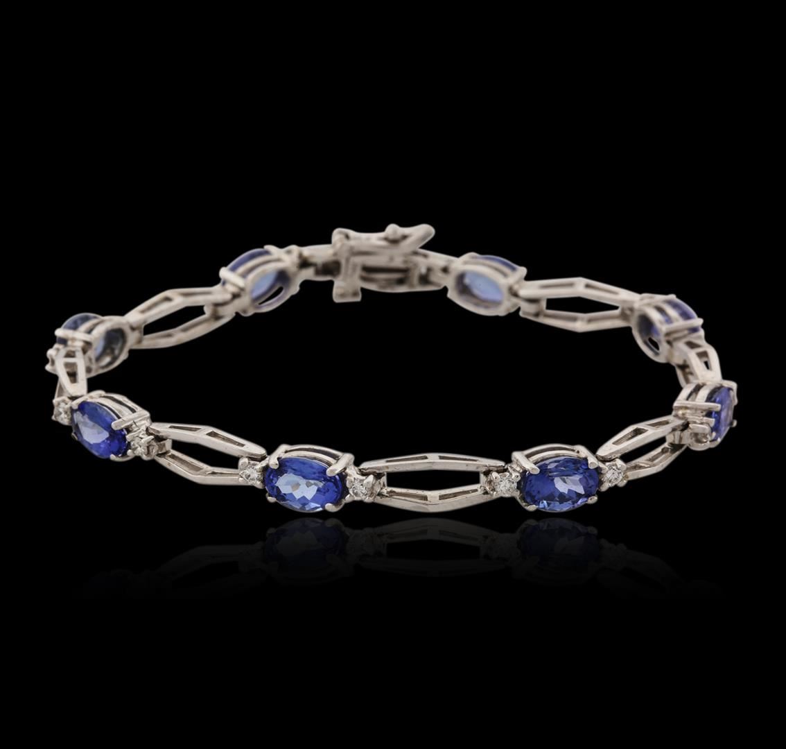 One electronically tested 14KT white gold ladies cast & assembled tanzanite and diamond bracelet with a bright polish finish. Seven inch length bracelet features a semi-flexible tanzanite and diamond ribbon, terminating in a concealed clasp with safety. Identified with markings of "14K". Condition is good. Containing: Eight prong set oval brilliant cut natural tanzanites, measuring 7.00 x 5.00 x 3.05mm, 6%. bulge factor, approximate total weight of 6.24ct., clarity is eye clean, type I, medium dark, very slightly grayish, violetish blue color, (GIA vB 6/3), cut is good. Transmitting light with no distortion, transparent. Measurements & the color grade are an average for the group. Graded in the setting. Tanzanite is a very rare gemstone that is only found in the country of Tanzania. Originally discovered in 1967. Tiffany & Company, named the stone Tanzanite. It is found in the Usumburu Mountains that border the Umba Valley of northern Tanzania. Tanzanite occurs in gray, brown, violet, blue, reddish-purple, & green. The gem is interesting because of its exceptional pleochroism. Rotated in different directions a tanzanite will exhibit multiple changes of color. Tanzanite has a low tolerance to ultrasonic cleaning, and should not be cleaned using this method. Sixteen prong set round brilliant cut diamonds, measuring 2.10 - 2.00 x 1.23mm (depth est.) approximate total weight of 16 Stones = 0.60ct. Graded in the setting. Clarity: SI-1 to I-1. Color: H - J. Total Weight of Colored Stones 6.24ct. Total Weight of Diamonds 0.60ct. Total Weight of Bracelet 12.15 grams. AIG Appraised at $7,915.00.